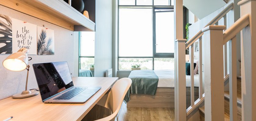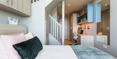 If you fancy more space, have more things, or like to have people over, these studios are for you. Bathroom Private Kitchen Private Utility bills All included Room size 20.2-21.8m² 3/4 double bed, wardrobe and study area complete with a desk and chair Private bathroom with large mirror Fully equipped private kitchen with a table and chairs