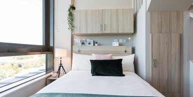 These rooms are located in the Tower block and provide more floor space than the Bronze ensuites. Bathroom Private Kitchen Shared Utility bills All included Room size 14.1m² 3/4 double bed, study area and plenty of storage Private bathroom with large mirror Kitchen and living room with TV and sofas shared by 6 bedrooms