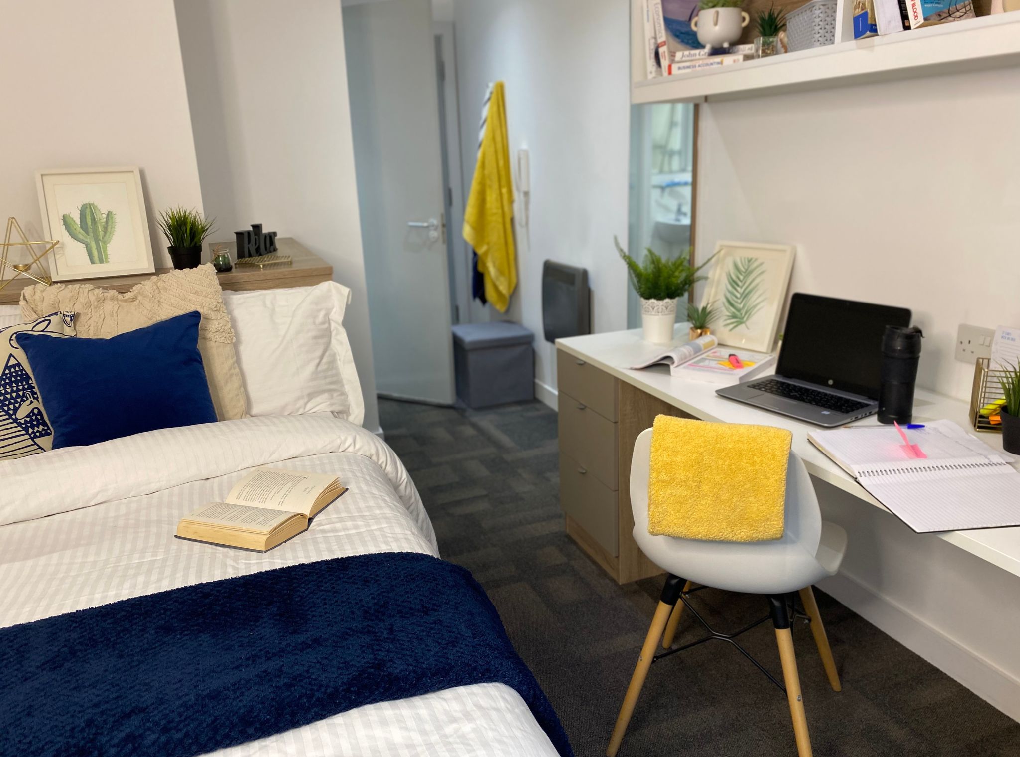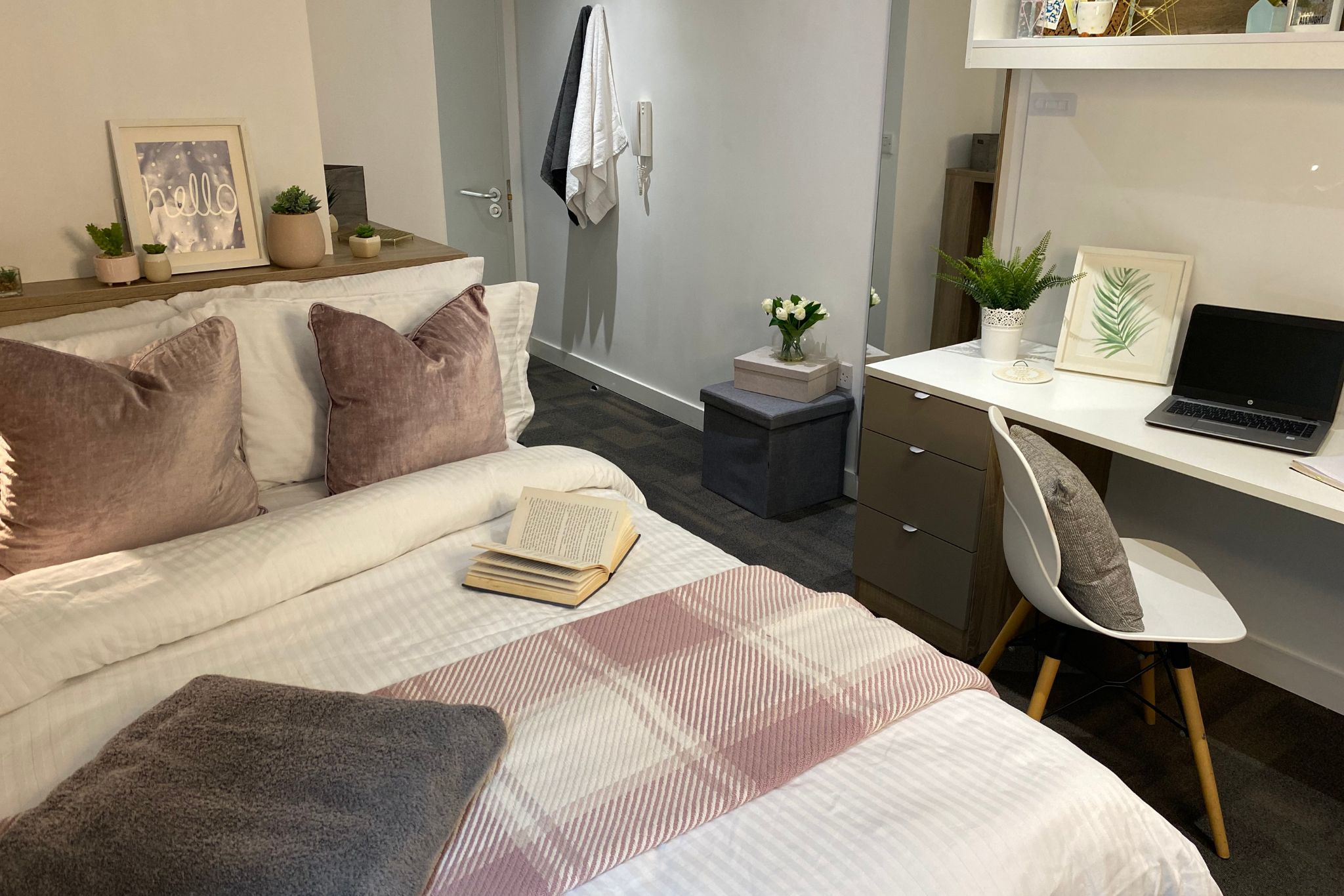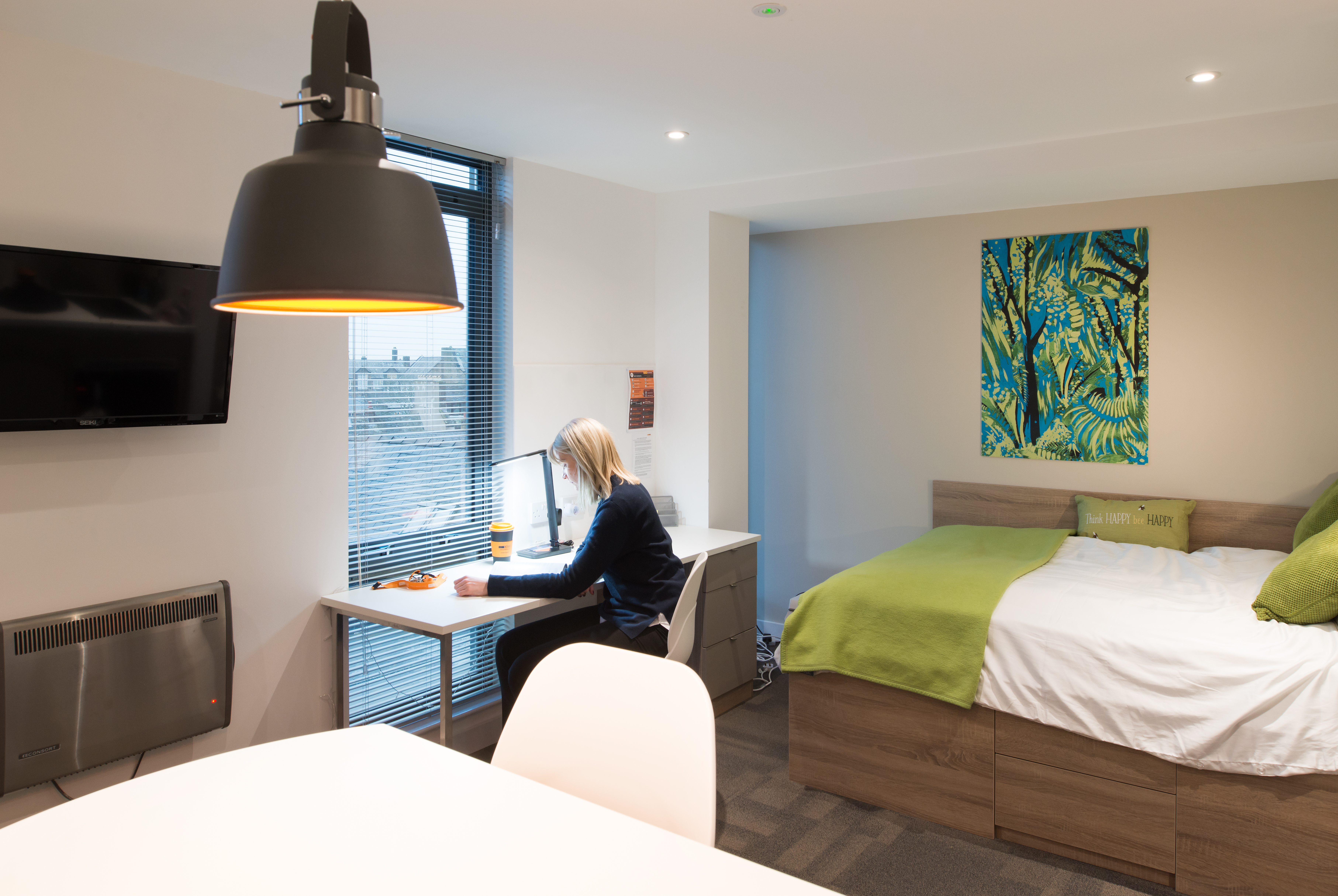 Small double bed, Shared fully equiped kitchen, Large desk, Full length mirror, 50” LCD TV with Freeview in communal area, Lift to all floors