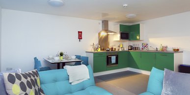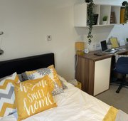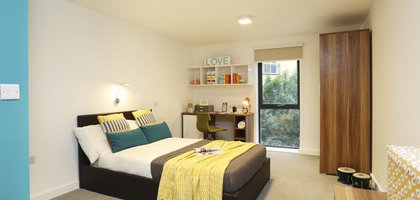Newly refurbished for September our studio rooms are bright, spacious and perfect for modern student living. Equipped with your very own private bathroom and kitchenette, your room will come with its own comfortable bed, study desk and chair, and wardrobe. The modern and vibrant décor, features handy storage solutions and easy-to-operate appliances for you to enjoy including your very own hob, microwave and fridge.
