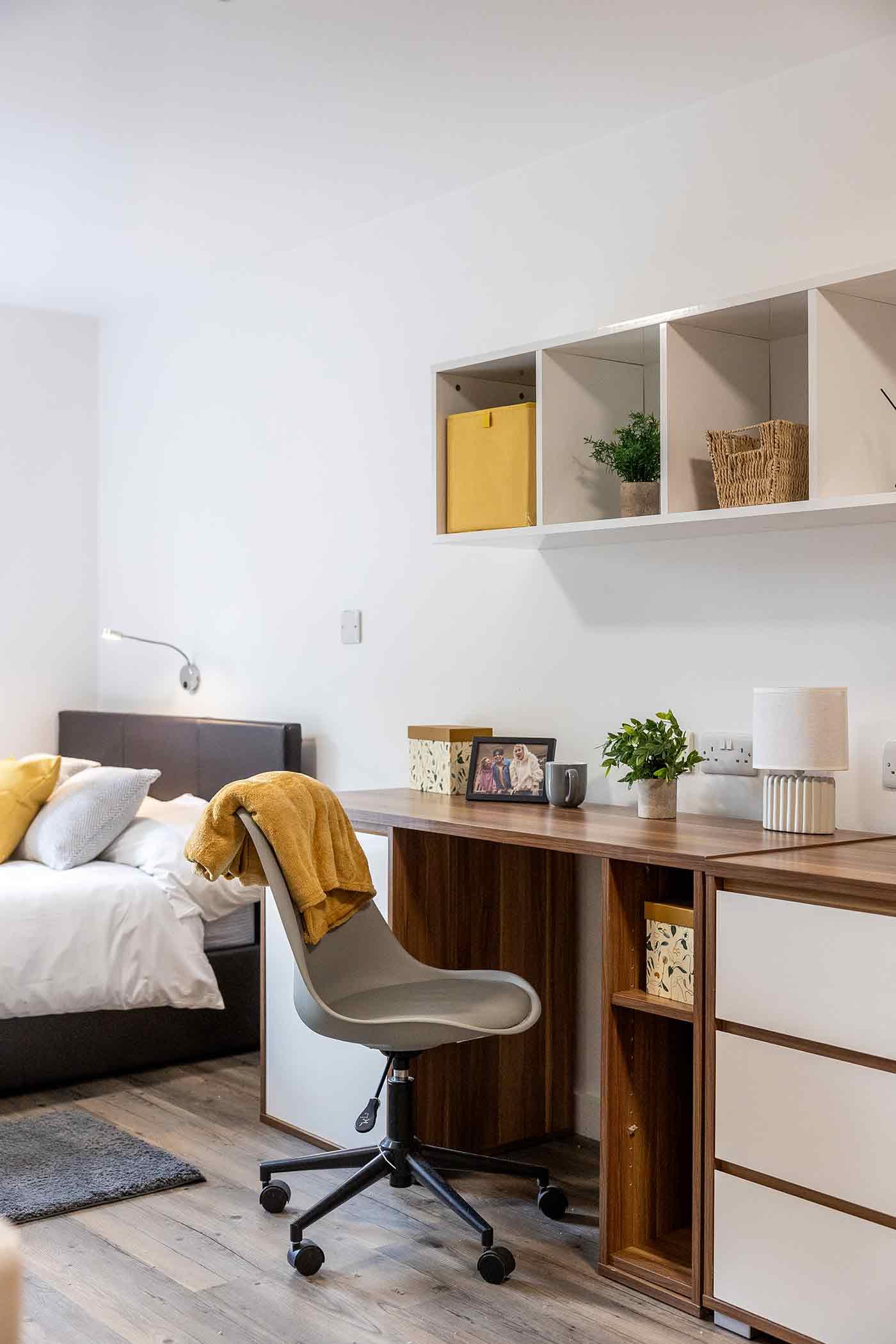 Newly refurbished for September our studio rooms are bright, spacious and perfect for modern student living. Equipped with your very own private bathroom and kitchenette, your room will come with its own comfortable bed, study desk and chair, and wardrobe. The modern and vibrant décor, features handy storage solutions and easy-to-operate appliances for you to enjoy including your very own hob, microwave and fridge.