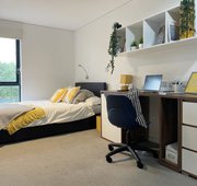 Our stylish premium ensuite rooms offer you that added extra space and comfort featuring a large bed, study area and wardrobe. Benefiting from your own private bathroom – the ensuite facility is fresh, bright and includes a large double shower unit. The communal area is ideal for catching up with friends and includes a shared kitchen, dining area, lounge, and flat-screen TV. It’s modern and vibrant décor combined with handy storage solutions and easy-to-operate appliances make it the perfect choice for you.