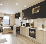 Room sizes may vary from 21m2 to 22.9m2 and offer access to a shared social kitchen and lounge as well as your own private kitche n. - Your own private studio - Private en-suite with shower - Small double bed with under bed drawer - Bedside shelving - Over bed storage - Double wardrobe - Study desk with shelving - Desk chair - Notice board - Coat hooks - Mirror - Whats in the kitchen? - Your own kitchen with plenty of storage - Breakfast bar stool - Under counter built in full or combi oven - 4 ring induction hob - Integrated fridge/freezer