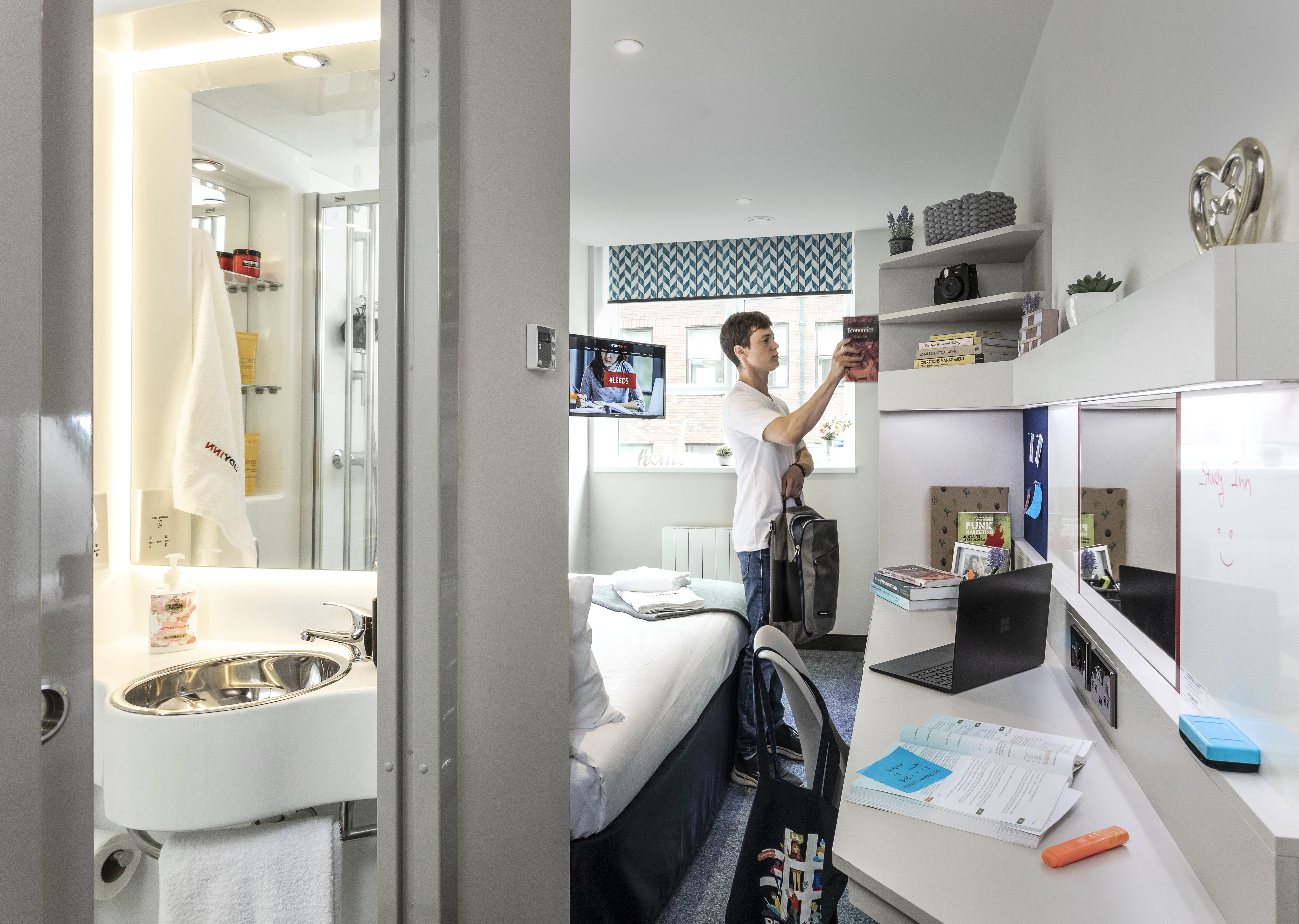 Our Platinum en-suite serviced apartments make the perfect place for lifelong friendships and bonds to be formed in Leeds. Made up of between 5-8 en-suite rooms, these luxurious serviced apartments provide the perfect opportunity for you to meet and live with others from all over the world. Each individual Platinum room offers student privacy and independence, whilst at the same time a community and family framework. These gorgeous rooms are slightly larger than the Gold rooms and include all the same essentials and benefits. The communal areas have been designed to optimize student living, meaning each living room is equipped not only with a 55-inch flat-screen smart TV but games consoles and games too. So relax and unwind with your new friends whilst sinking into one of the luxuriously comfy sofas and enjoy your new life in Leeds.