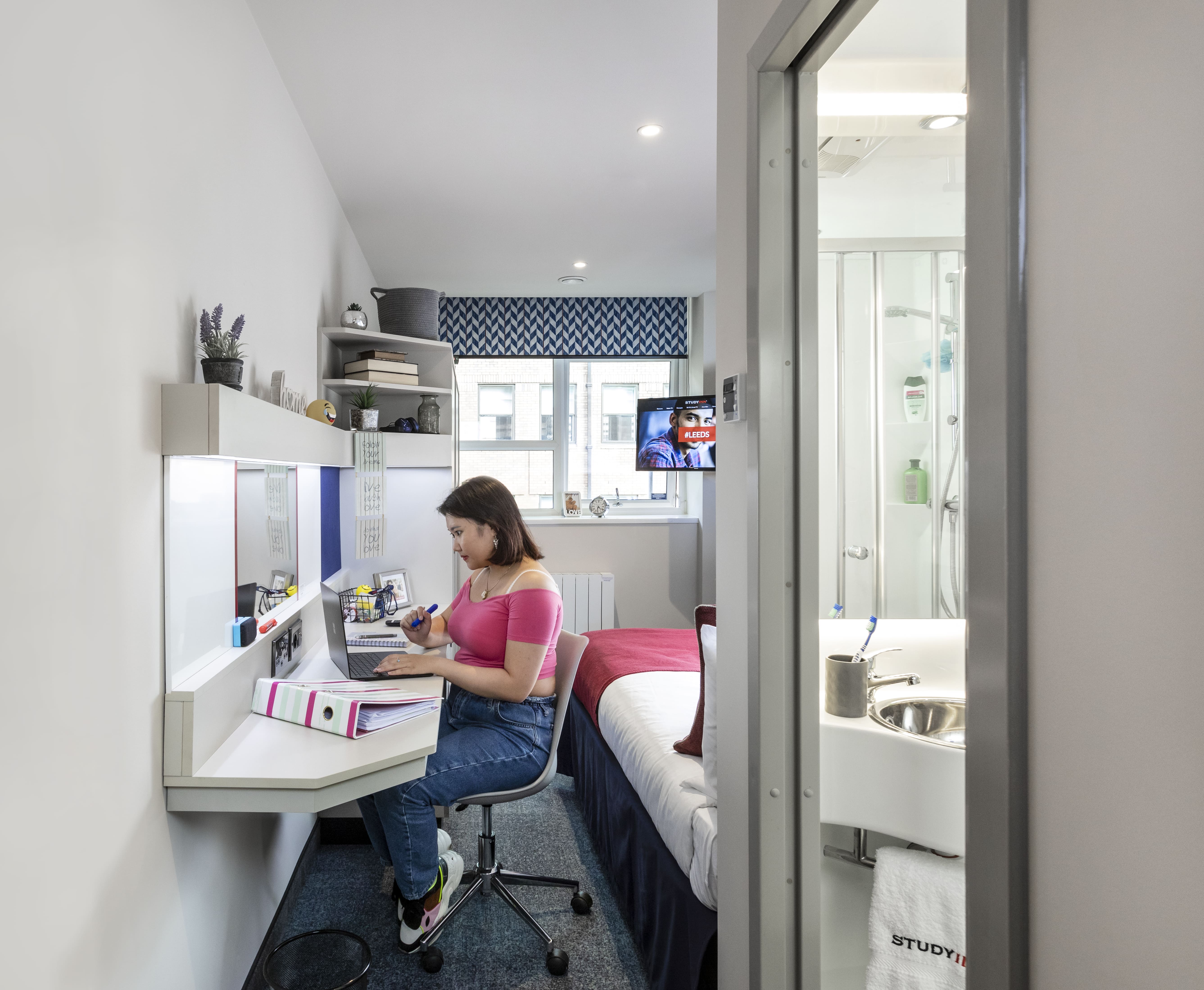 Our luxury serviced apartments offer the perfect balance between the privacy of your own en-suite bedroom and the opportunity to interact with other students. Each apartment includes en-suite bathroom, double bed, study area, spacious wardrobes, and smart TV. Additionally, residents of our apartments enjoy exclusive access to the Luxe Lounge, a sophisticated and vibrant space designed for relaxation, socialization, and entertainment.