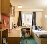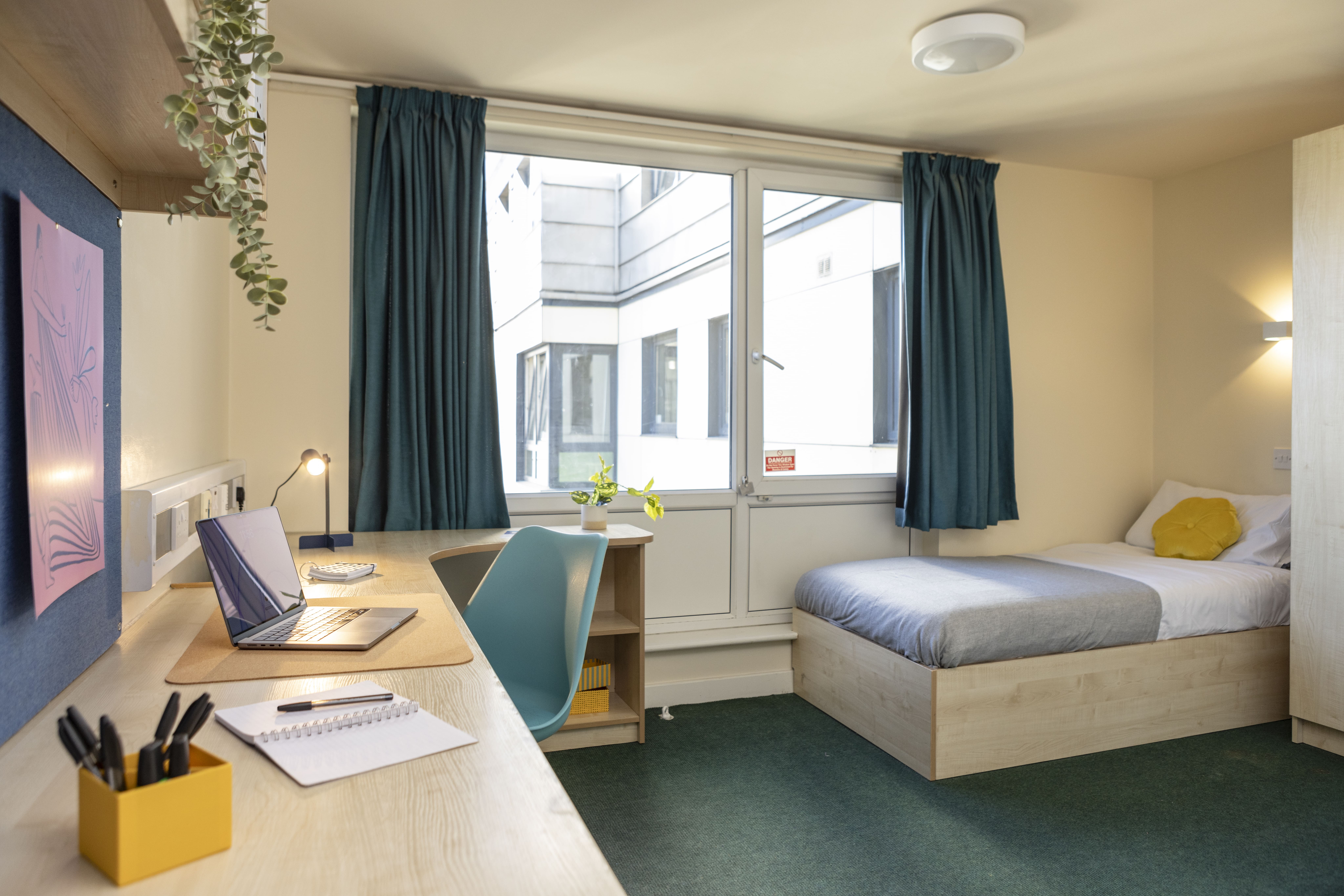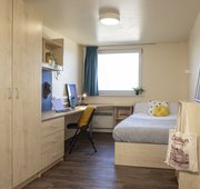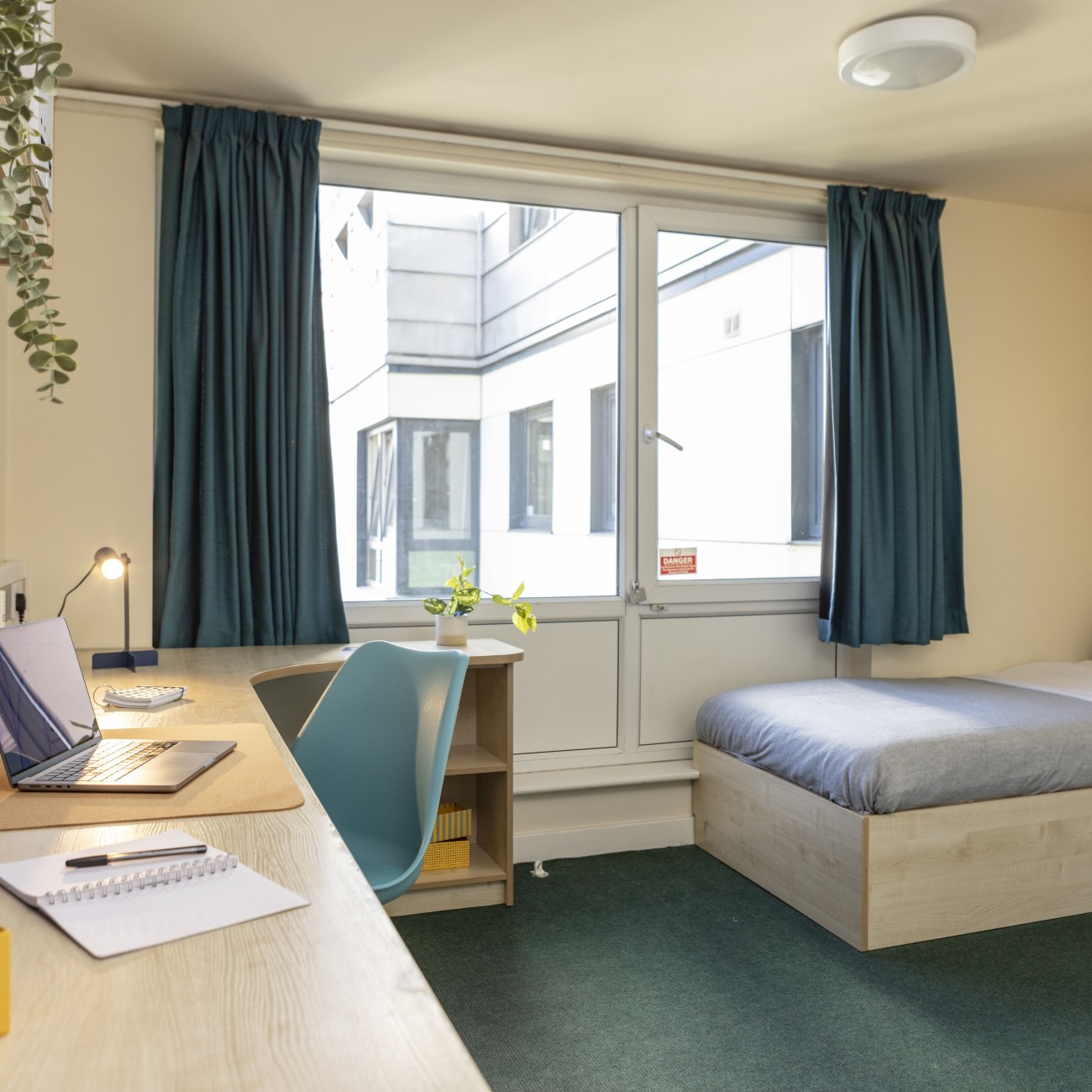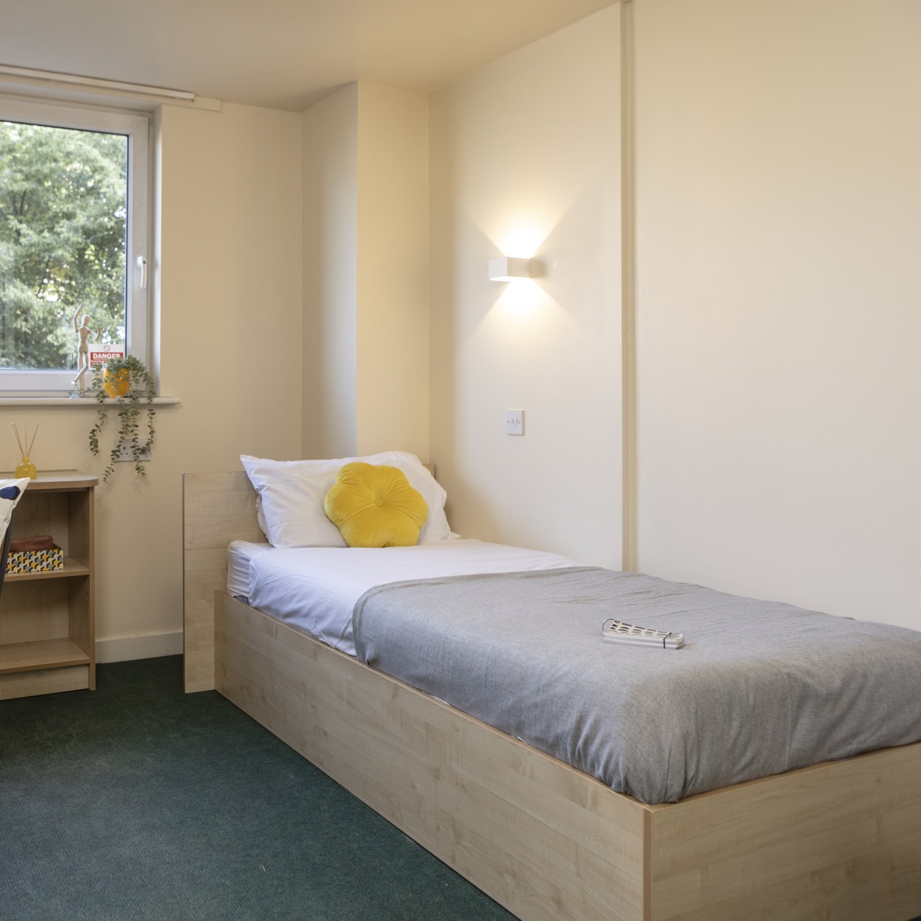 When you come to university in Leeds, you'll see that your Bronze Room is comfortable and bright, with an en-suite bathroom and lots of floor space; whether you're having a movie night with friends or you're teaching yourself yoga. These bedrooms also come with shelves, drawers and a handy bookcase for all your notes and textbooks, as well as a spacious wardrobe.