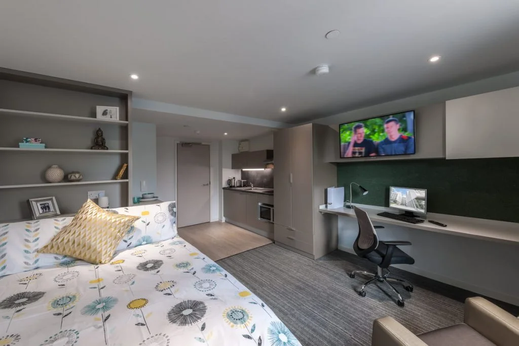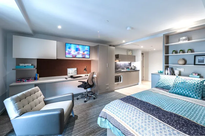 Live and study in this spacious bronze studio apartment with ample storage and stylish fitted furniture.