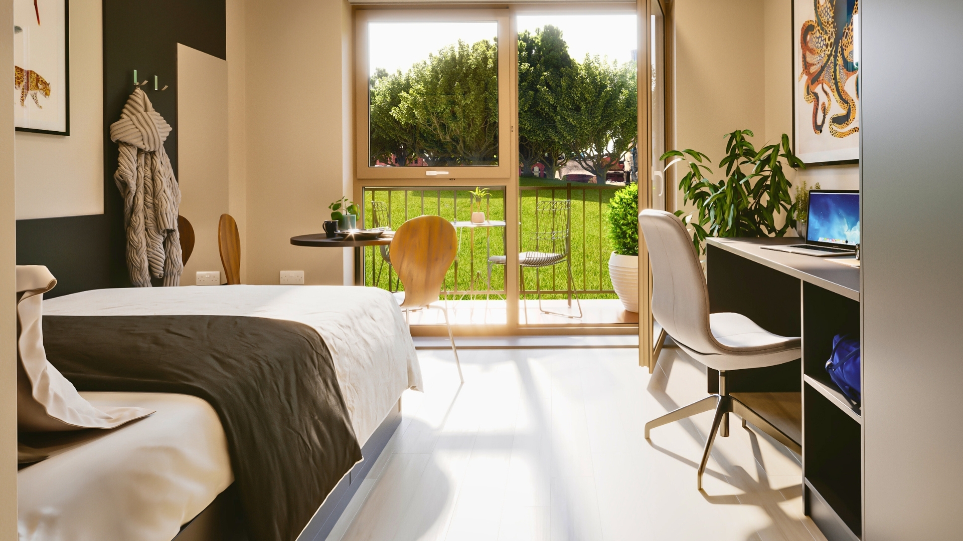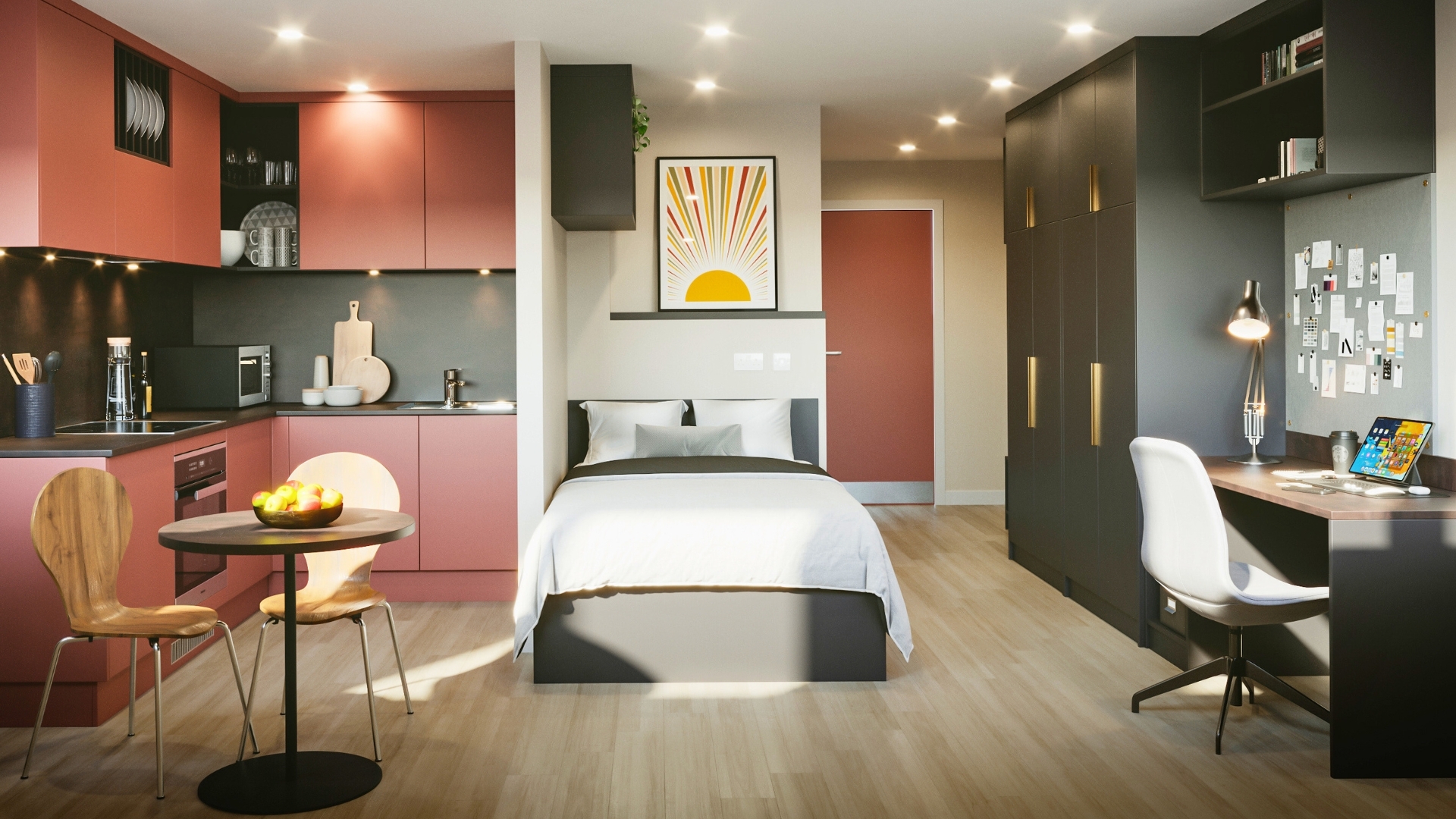 Fully furnished en-suite bedroom with a private juliette balcony, private bathroom, 3/4 double bed with underbed storage, private open plan kitchen. A large desk, chair, bookshelves and noticeboard for studying. Wardrobe and full length mirror. Free Wi-Fi and internet.