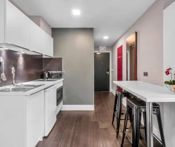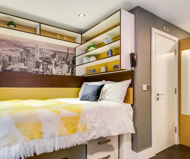 The Smart apartment gives you the room to sleep, study and socialise. This medium size apartment has a comfortable double bed, en-suite bathroom, and a fitted kitchen. Size 19m² - 22m². Prices may differ as per the floor.
