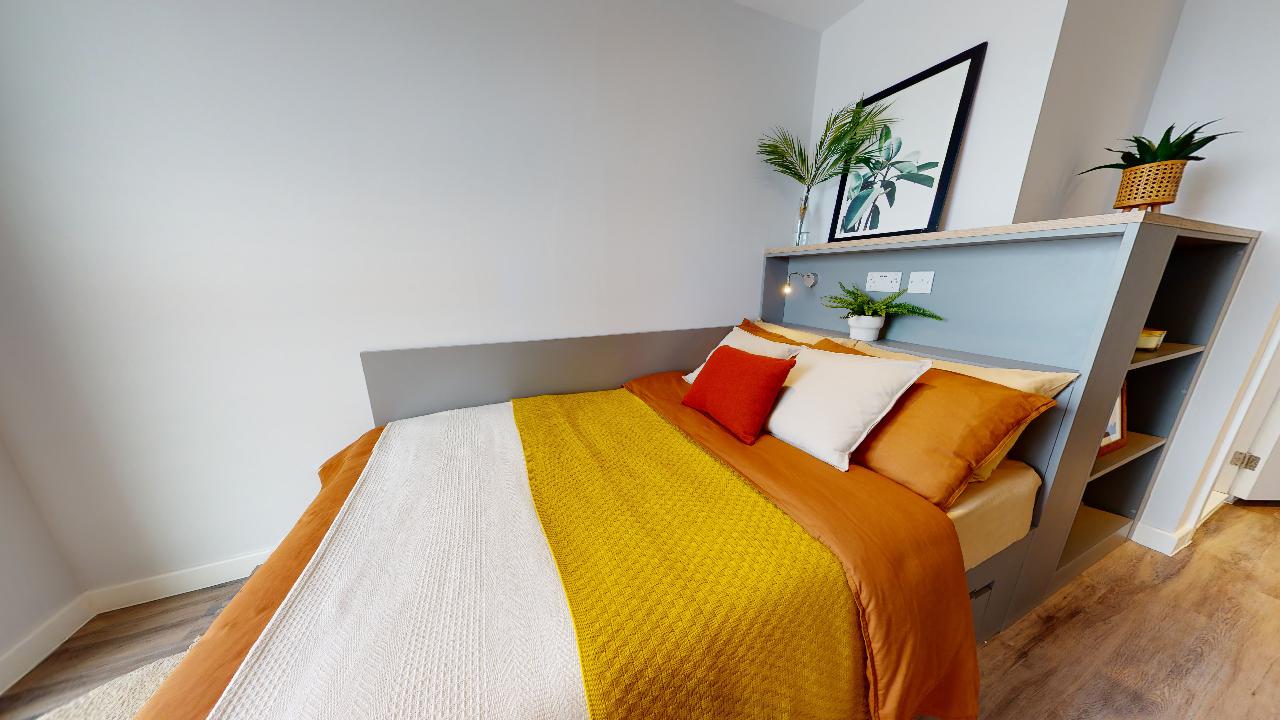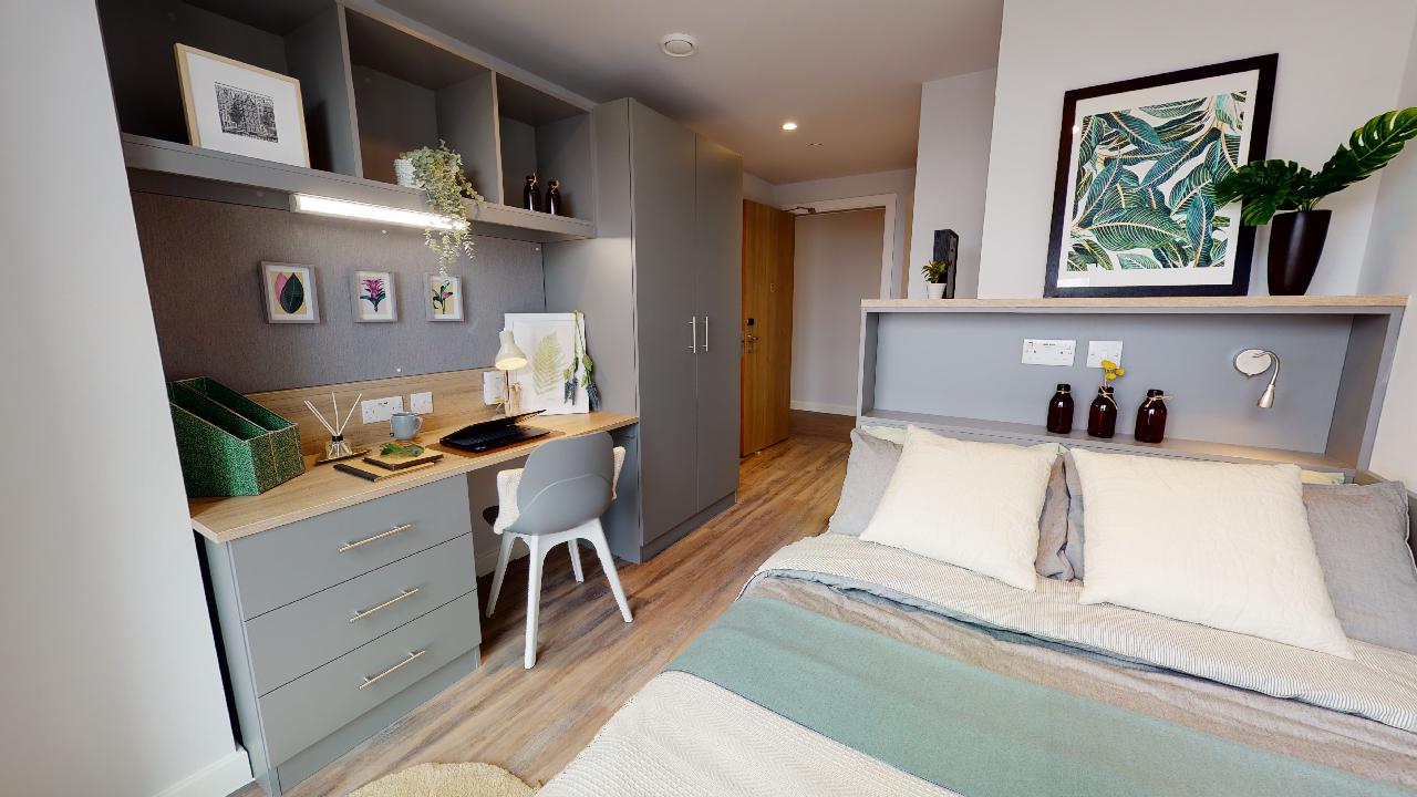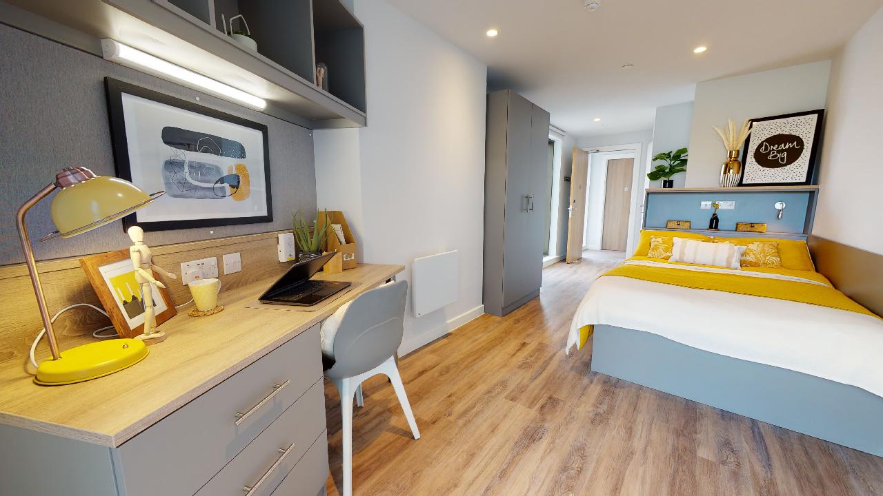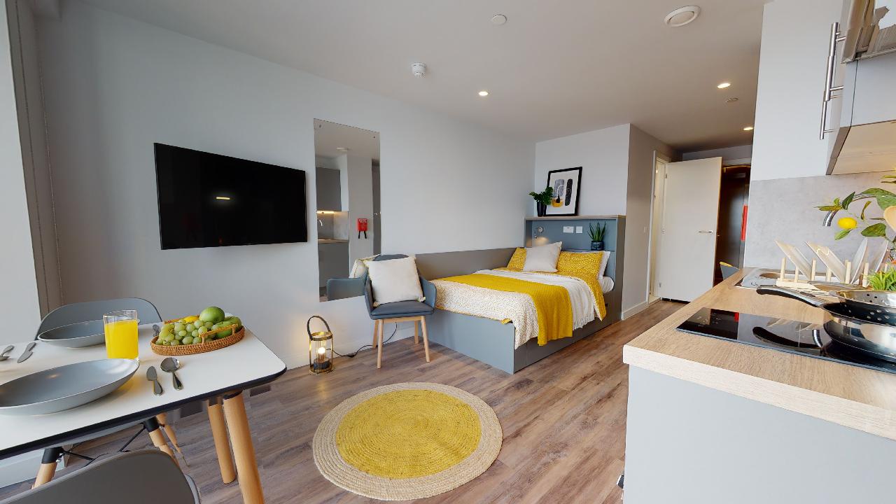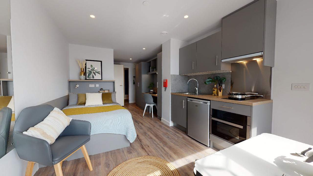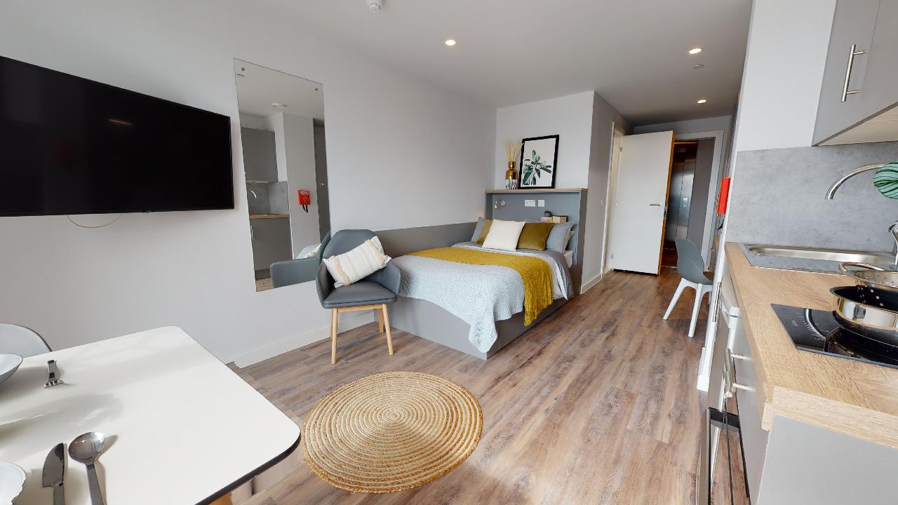 Close to the city's universities, these brand new studios give you all you need, with a shower room, study area, small double bed, TV, kitchen and plenty of storage space. Our social spaces are also available to you.