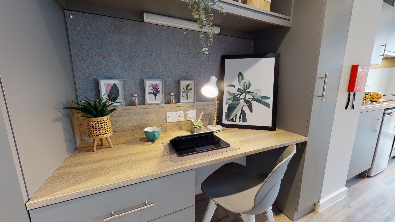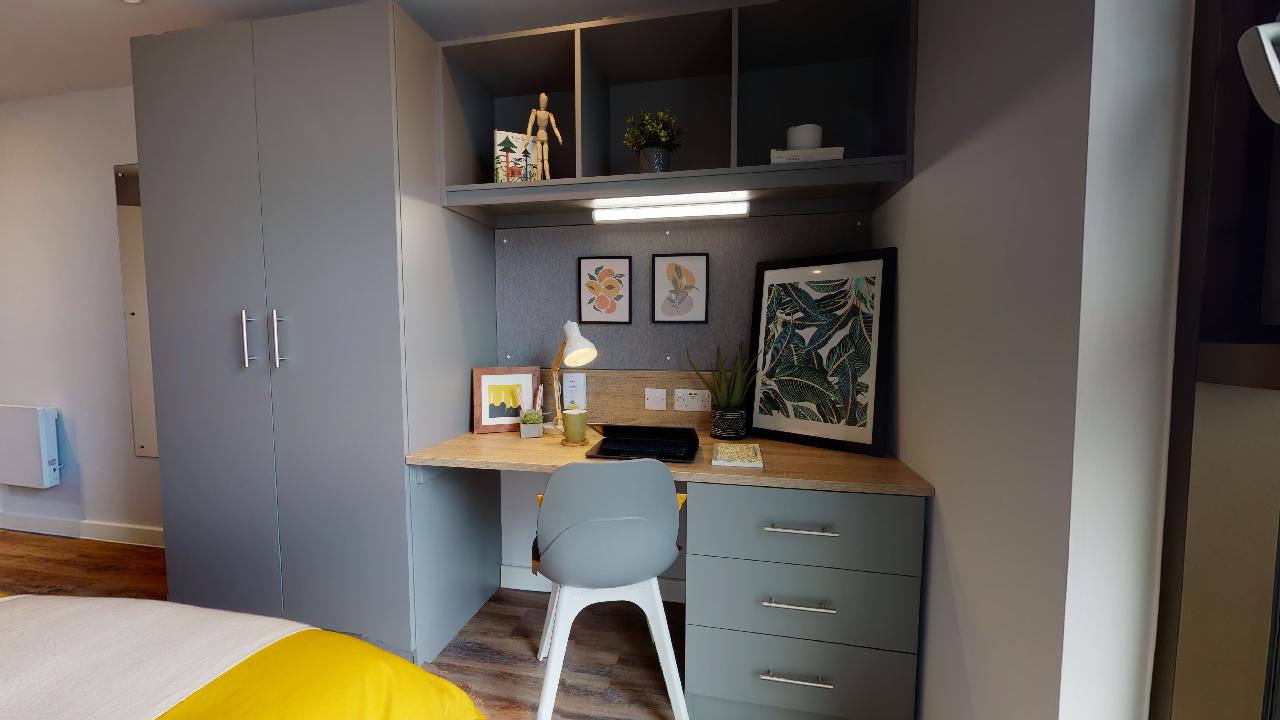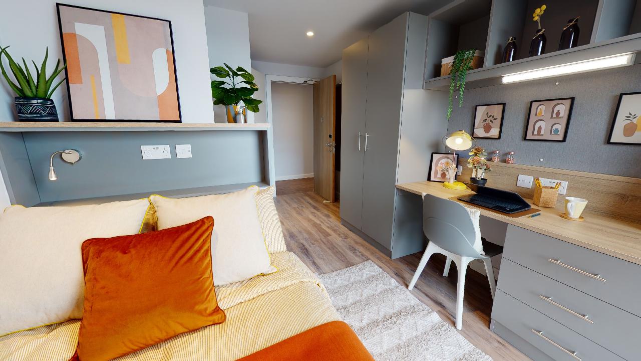 Our Bronze Studios offer extra independence, with your own shower room, a study area, small double bed, TV, kitchen and plenty of storage space. All of the amenities and social spaces at Altus House are available to you too.