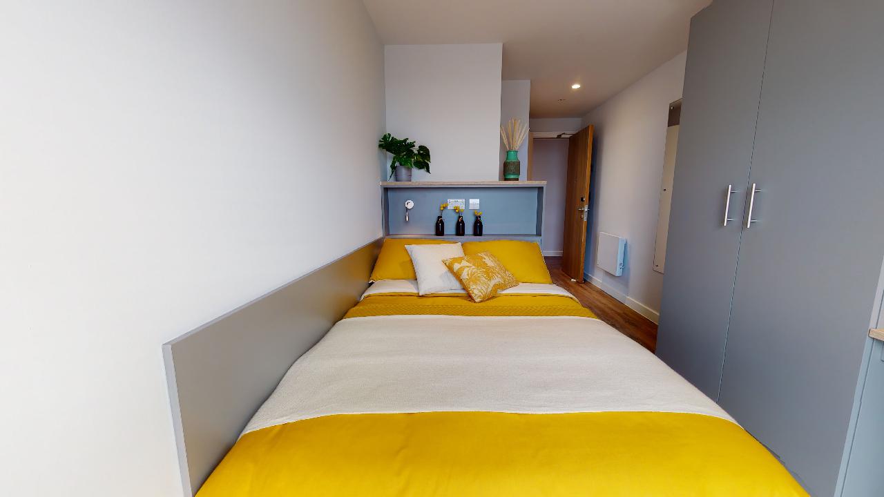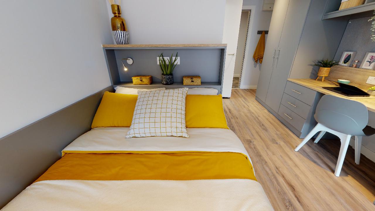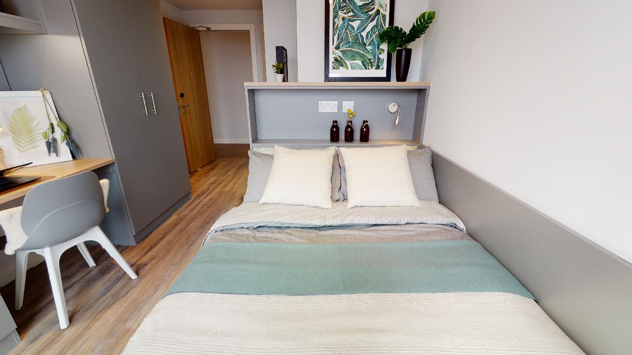 ALTU300-031125Private studio Private bathroom Small double bed Located on floor 10-24, a Silver Studio combines ample space with the best views of the city. Offering 22 sq m of living space, this south-facing studio is large enough to share. Close to the city's universities, these brand new studios give you all you need, with a shower room, study area, small double bed, TV, kitchen and plenty of storage space. Our city-view roof terrace and social spaces are also available to you. hared kitchen TV & sofas in shared kitchen Small double bed Study desk and chair Wardrobe Underbed storage Private bathroom with shower