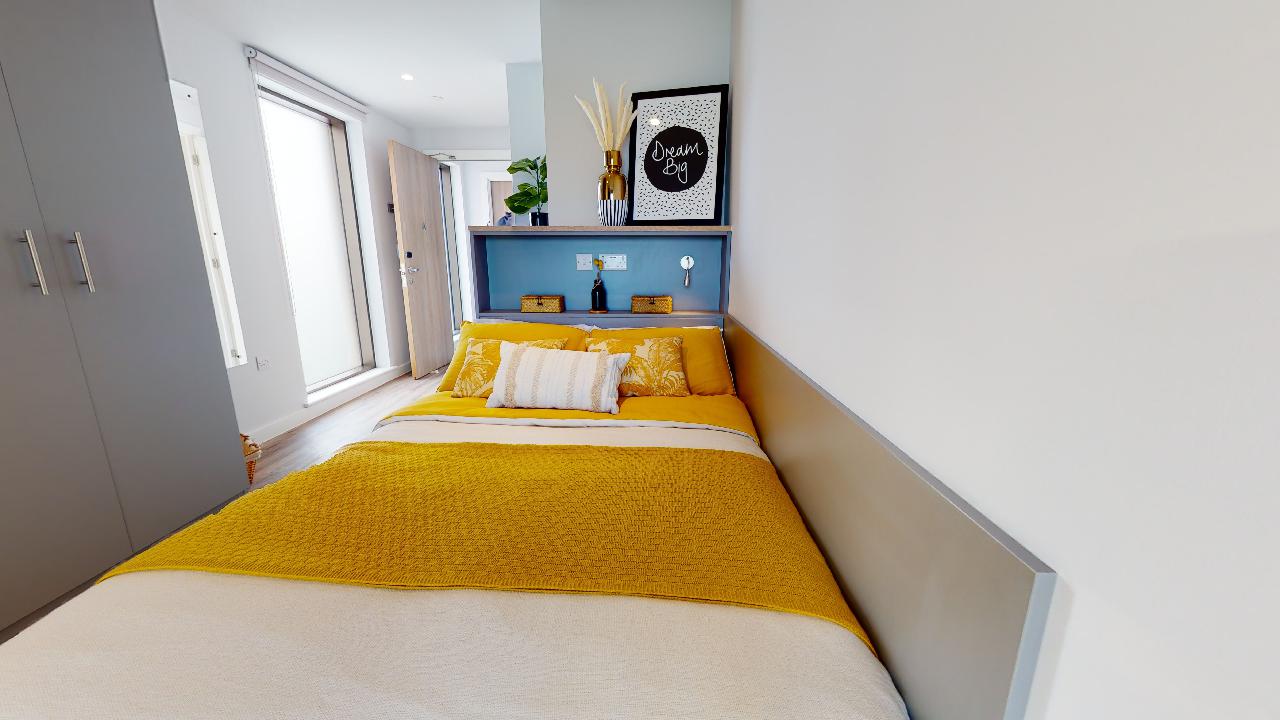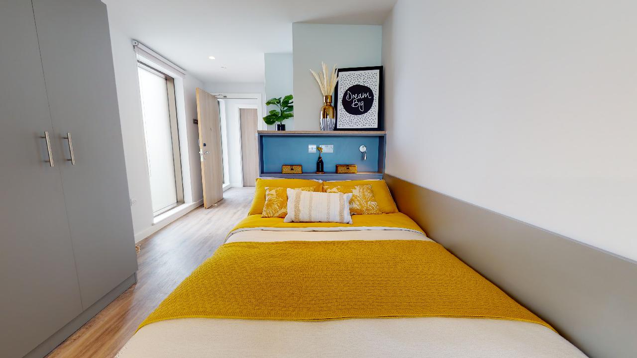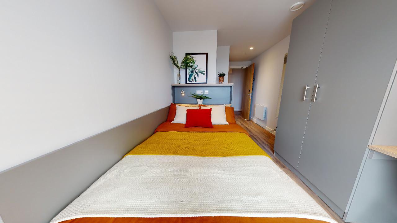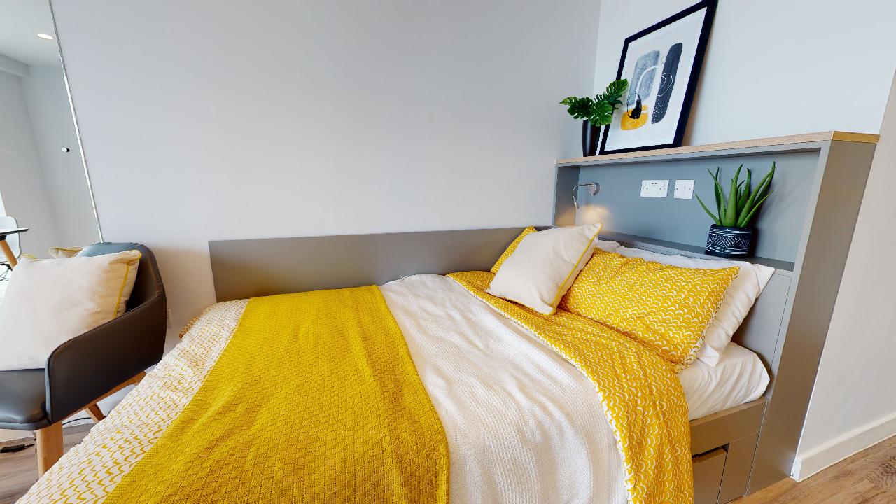 ALTU300-031125Private studio Private bathroom Small double bed Located on floor 10-24, a Silver Studio combines ample space with the best views of the city. Offering 22 sq m of living space, this south-facing studio is large enough to share. Close to the city's universities, these brand new studios give you all you need, with a shower room, study area, small double bed, TV, kitchen and plenty of storage space. Our city-view roof terrace and social spaces are also available to you. hared kitchen TV & sofas in shared kitchen Small double bed Study desk and chair Wardrobe Underbed storage Private bathroom with shower