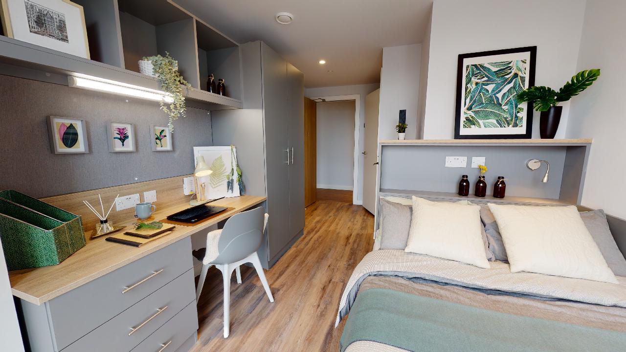 Close to the city's universities, these brand new studios give you all you need, with a shower room, study area, small double bed, TV, kitchen and plenty of storage space. Our social spaces are also available to you.