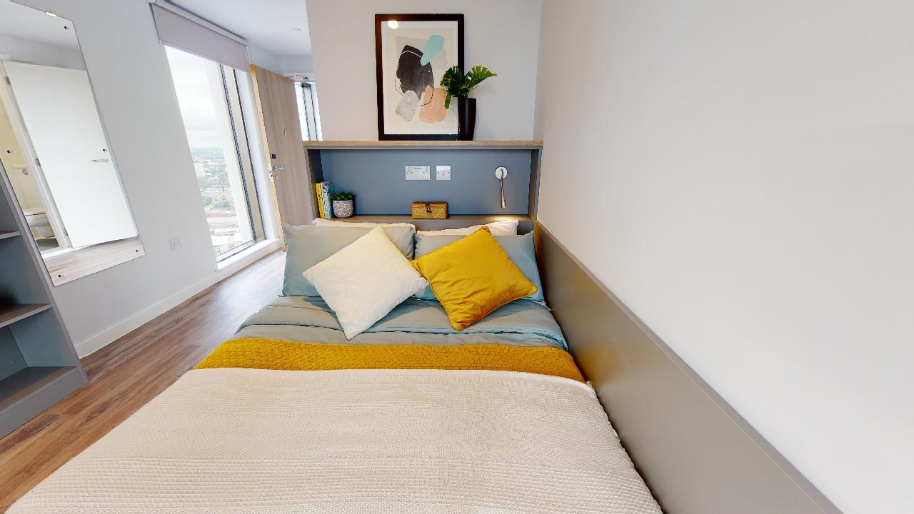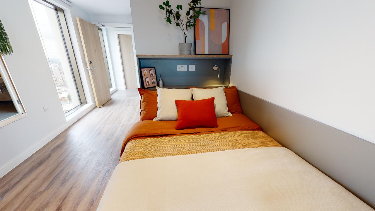 ALTU300-031125Private room Private bathroom City view Offering 17 sq m of living space, these rooms on floors 32-35. You'll have all the essentials you need and superb views across Leeds. These brand new, spacious rooms on our higher floors give you a study area, small double bed and ample storage, as well as an en suite shower room. A well-equipped kitchen and living area with TV offers a place to relax with your flatmates, and you'll have the use of all the building's amenities and social spaces, including our roof terrace, cinema and fitness studio.Small double bed Shared kitchen Study desk and chair Wardrobe Underbed storage TV & sofas in shared kitchen Private bathroom with shower