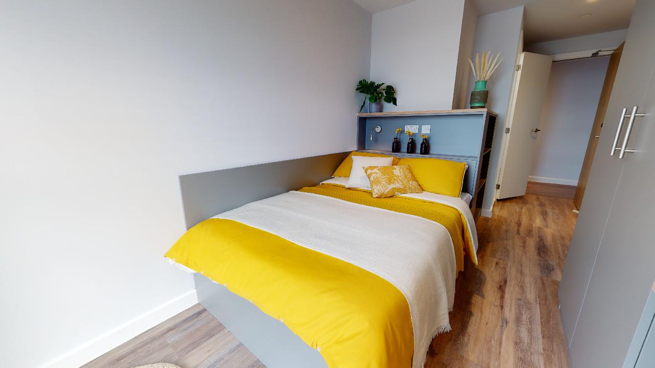 ALTU300-031125Private room Private bathroom Small double bed Conveniently located for Leeds' uni campuses, these rooms are found on floors 10-24, and offer 14sq m of living space with all the essentials. Your brand new room comes with a bed, study area, en suite shower room and plenty of storage space. You'll share a modern, well-equipped kitchen and living area with TV, and have the use of all the onsite amenities and social spaces including our fitness studio, cinema and roof terrace. Shared kitchen TV & sofas in shared kitchen Wardrobe Study desk and chair Underbed storage Private bathroom with shower Small double bed
