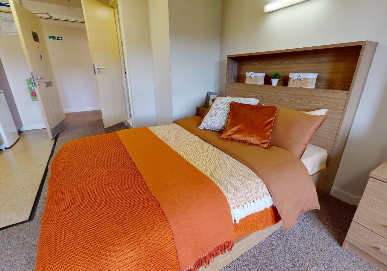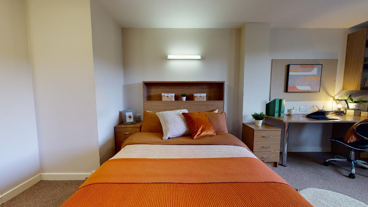 LEED300-031125Located on all levels throughout the building these rooms provide 14 sq m of space and great value for money. Coming with a small double bed with underbed storage, private bathroom, and modern style study desk and modern chair. You’ll be sharing a well-equipped open plan living room and kitchen with three to six others. Featuring all the essential equipment, sofas and a coffee table, there’s plenty of room to cook and lounge. With a gym and laundry also in the building, you’ll be well set up for a great student life.