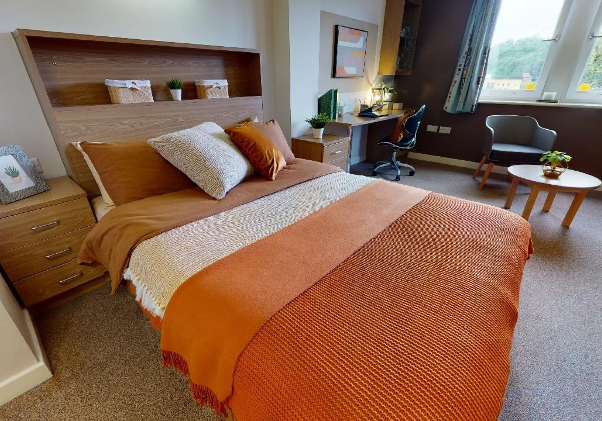 LEED300-031125These en suites make great use of the extra space on offer, with 14 sq m consisting of a double bed and underbed storage, study area with desk, sufficient storage and, of course, a private bathroom. The Platinum En Suite rooms can be found on various levels throughout the property. A well-equipped communal open plan living room and kitchen shared with up to five others means you get privacy combined with sociability. Featuring essential appliances, sofas and a coffee table, there’s loads of room to cook and lounge. The building also features onsite gym and laundry, giving you everything you need.