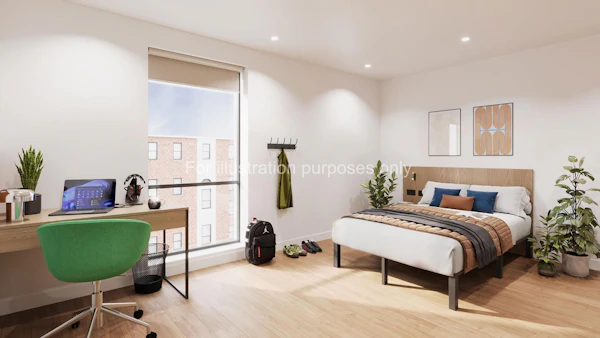 Our Studios are designed to give you privacy, whilst giving you all the necessary amenities to live your best student life. They are spacious accessible rooms with a large, wheelchair-friendly bathroom and they are located on the first, second, third, fourth and fifth floors. Each studio is a spacious 27 square metres in size, is fitted with acoustic flooring to keep things quiet, and includes: a compact double bed and mattress, large LCD smart TV, a wardrobe and plenty of storage space, study desk & chair, breakfast bar and stool, kitchenette and ensuite shower room. Your kitchenette is fitted with a fridge with freezer shelf, 2-ring hob, microwave-oven and lots of cupboard space to store your things.