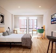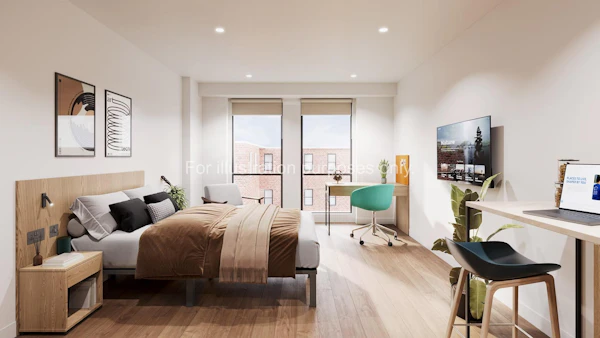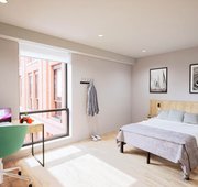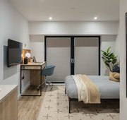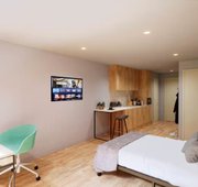 Our Superior Studios are designed to give you privacy, whilst giving you all the necessary amenities to live your best student life. They are located on floors 6 to 10. Each studio is a spacious 28 square metres in size, is fitted with acoustic flooring to keep things quiet, and includes: a compact double bed and mattress, large LCD smart TV, a wardrobe and plenty of storage space, study desk & chair, breakfast bar and stool, kitchenette and ensuite shower room. Your kitchenette is fitted with a fridge with freezer shelf, 2-ring hob, microwave-oven and lots of cupboard space to store your things.