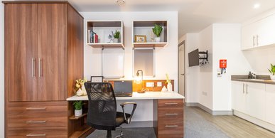 Our Premium Studios are the ultimate in student self-contained accommodation. With between 34-43m2, they offer top of the market spaciousness. Living in these studios provides residents with privacy in a relaxed and calm atmosphere. Well appointed, there is room for all your belongings in shelving, wardrobe and underbed storage. A double bed and study desk & chair provides space for sleeping and studying but there is also plenty of room for a fully fitted kitchenette and a seating and dining table. The kitchenette has oven/hob, microwave, dishwasher , toaster & kettle; everything you need to rustle up meals. We also provide a 32" Smart TV when you want a break from the books and a comfy seating area to relax on. With 200Mb wi-fi and in internet and USB charging port your digital needs are catered for