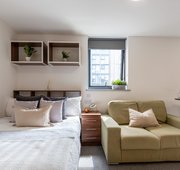 Our standard Studios are larger than most on the market at 27m2. They offer everything you need for self contained living. These are particularly popular with students who want to have their own privacy for focusing on their studies. The studio includes a double bed, desk area with plenty of storage in shelving, wardrobe and under bed storage. A TV point, USB charging point, internet port, 32" Smart TV and 200Mb wi-fi, all your digital needs are catered for. The kitchenette is fully fitted with hob, oven, microwave, dishwasher, toaster and kettle.There is a comfy seating area, dining table and chairs for relaxing and eating.
