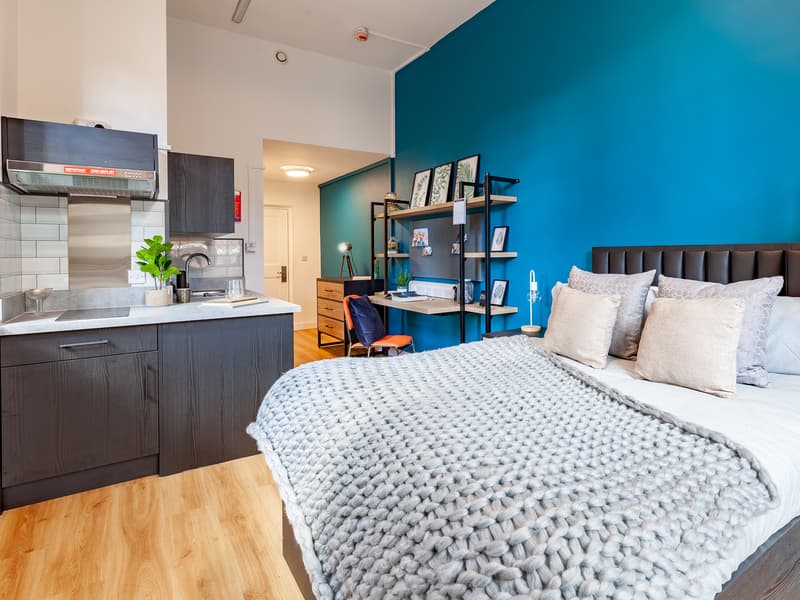 Feel right at home in our Deluxe Studio apartment, ranging from 27 – 39m2, , which has been designed for the modern student. Sink into your comfortable bed, and when it’s time to focus, sit at your very own study desk and concentrate with no distractions. Fancy a bite to eat? Show off your cooking skills in your modern kitchen! Complete with a combi-oven, cooking hobs and a fridge/freezer. Along with a private bathroom and ample storage space, you’ll love the space this room has to offer as soon as you take a step inside.