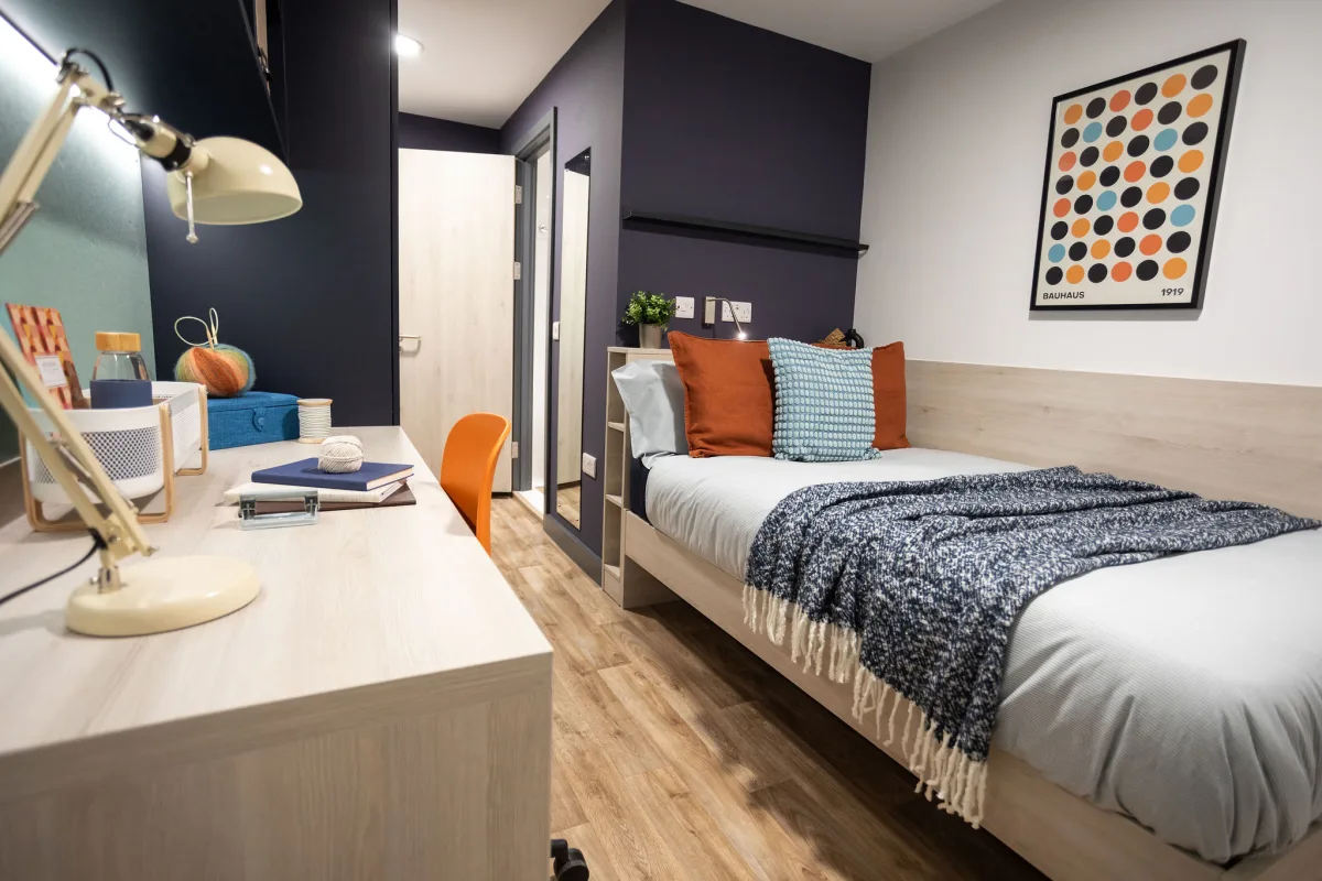 The Deluxe En-suite is perfect for students who enjoy a close-knit living environment, with room sizes ranging from 12.75m² to 20.26m². Each private bedroom includes a small double bed with storage, a study desk, wardrobe, bookshelf, and an en-suite bathroom. The shared kitchen and lounge feature a dining area, comfortable sofas, a TV, and essential kitchen appliances, making it a great place to cook, eat, and socialise. Whether you’re looking for a peaceful space or fun communal vibes, this en-suite provides the best of both. Book now and make this your student home!