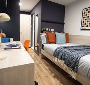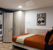 Room sizes vary between 12.60m2 and 16.01m2 - Your own private bedroom - Private en-suite with shower and WC - Small double bed with storage/shelving - Wardrobe - Chest of drawers - Study desk and chair - Bookshelf - Pin/Noticeboard - Mirror - Coat hooks -- Whats in the shared kitchen? - Shared kitchen between 7 - Preparation area with two sinks, two sets of four ring hobs and two ovens - Plenty of storage - Fridge/freezer - Dining area with seating - Lounge with sofas, coffee table and TV