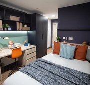 Room sizes vary between 20.23m2 and 28.99m2 - Accessible rooms available - Your own private studio - Private en-suite with shower and WC - Double bed with storage/shelving - Wardrobe - Chest of drawers - Study desk and chair - Bookshelf - Pin/Noticeboard - Mirror - Coat hooks - Your own kitchen with storage - Preparation area with sink, two ring hob and oven - Fridge/freezer - Dining table / breakfast bar and seating