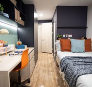 Room sizes vary between 12.75m2 and 20.26m2 - Accessible rooms available - Your own private bedroom - Private en-suite with shower and WC - Small double bed with storage/shelving - Wardrobe - Chest of drawers - Study desk and chair - Bookshelf - Pin/Noticeboard - Mirror - Coat hooks -- Whats in the shared kitchen? - Shared kitchen between 5 - Preparation area with sink, four ring hob and oven - Plenty of storage - Fridge/freezer - Dining area with seating - Lounge with sofas, coffee table and TV