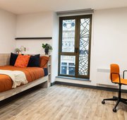 Room sizes vary between 12.67m2 and 13.38m2 - Rooms are located on higher floors, 16 - 18 - Your own private bedroom - Private en-suite with shower and WC - Small double bed with storage/shelving - Wardrobe - Chest of drawers - Study desk and chair - Bookshelf - Pin/Noticeboard - Mirror - Coat hooks -- Whats in the shared kitchen? - Shared kitchen between 6 - Preparation area with sink, four ring hob and oven - Plenty of storage - Fridge/freezer - Dining area with seating - Lounge with sofas, coffee table and TV