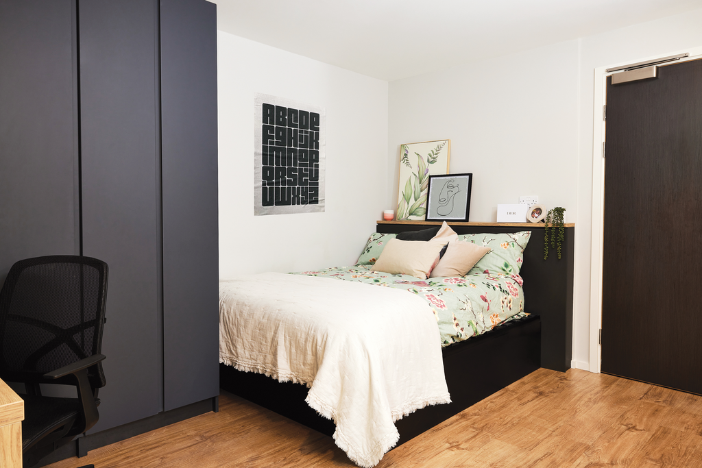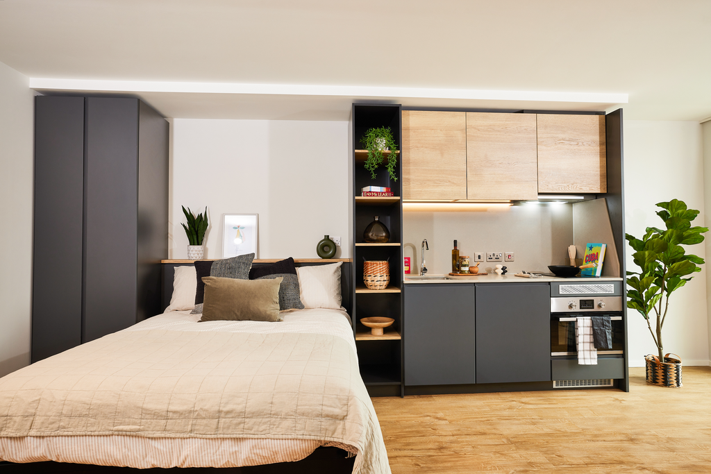 The classic Vita Student studio with double bed, ensuite bathroom, desk area and kitchen. Prices may vary for floors. Prices may vary as per the floor level.