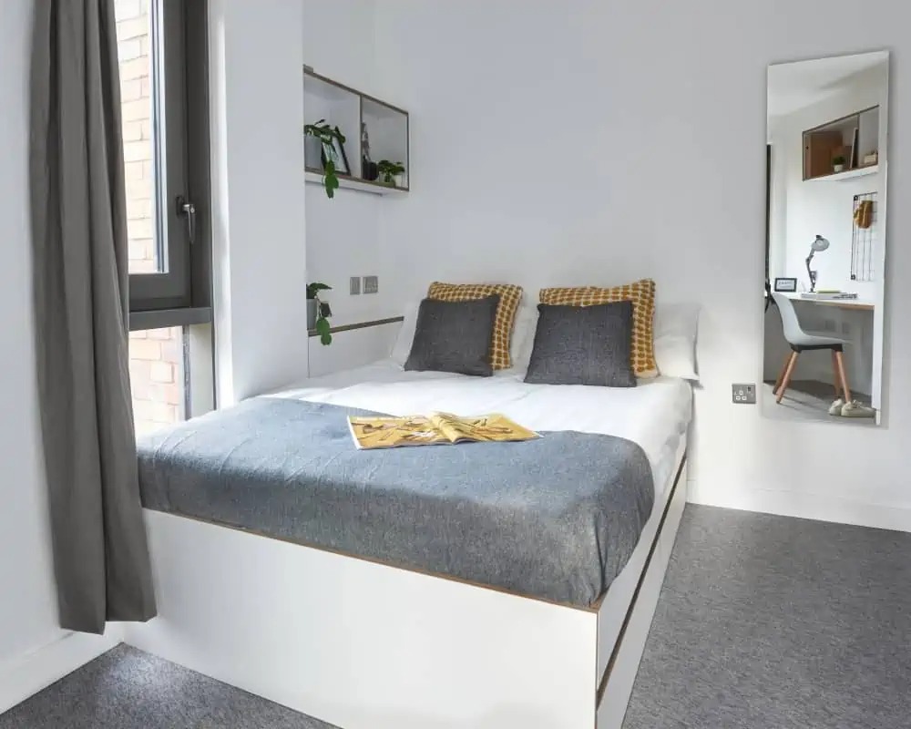 The living space. Room size - From 15.7m² Bed - 3/4 double bed Studying - Large desk and chair Storage - Spacious wardrobe, Underbed storage, Bookshelves The amenities. Bathroom - En-suite Kitchen - Shared kitchen Appliances - Microwave, toaster, kettle, Dishwasher Internet - Free Wi-Fi & internet (up to 200Mb shared) TV - Shared Freeview TV
