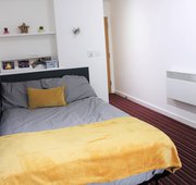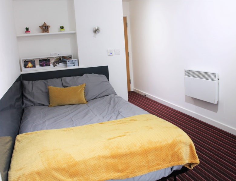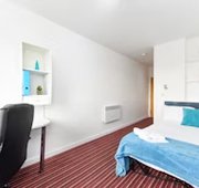 Self-contained studio with bedroom kitchen and bathroom. Floors 3-5. Situated on floors 3-5, accessible by lift Example room. Photography is for illustrative purposes, actual room may vary. Approximately 21.9m² Small Double bed Wardrobe, desk and chair, plus sofa and TV (Please note that bedding and other soft-furnishings are not included) En-suite bathroom with a shower cubicle, WC and wash basin 2 ring hob, microwave/combi-oven, fridge freezer and washer/dryer