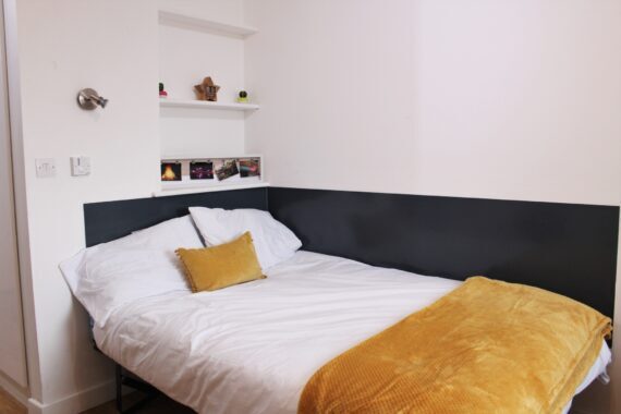 Self-contained studio with bedroom, kitchen and bathroom. Situated on top floor, accessible by lift Approximately 20.4m² Small Double bed Wardrobe, desk and chair, plus sofa and TV (Please note that bedding and other soft-furnishings are not included) En-suite bathroom with a shower cubicle, WC and wash basin 2 ring hob, microwave/combi-oven, fridge freezer and washer/dryer