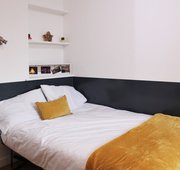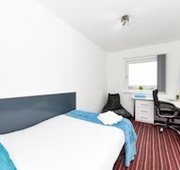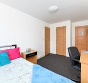 Communal kitchen and living space. Up to 5 rooms per flat Rooms accessible by lift. Double bed, wardrobe, desk and chair (Please note that bedding and other soft-furnishings are not included) Open kitchen/ living area with sofas and washing machine En-suite bathroom with shower cubicle Approximately 19.3m²