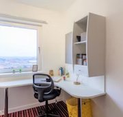 Communal kitchen and living space. Up to 4 rooms per flat Situated on the top floor, accessible by lift Approximately 15.9m² Small double bed, wardrobe, desk and chair (Please note that bedding and other soft-furnishings are not included) Open kitchen/ living area with sofas and washing machine En-suite bathroom with shower cubicle
