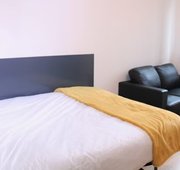 Self-contained studio with bedroom, kitchen and bathroom. Floors Ground - 2, accessible by lift Approximately 21.3m² Small Double bed Wardrobe, desk and chair, plus sofas and TV (Please note that bedding and other soft-furnishings are not included) En-suite bathroom with a shower cubicle, WC and wash basin 2 ring hob, microwave/combi-oven, fridge freezer and washer/dryer