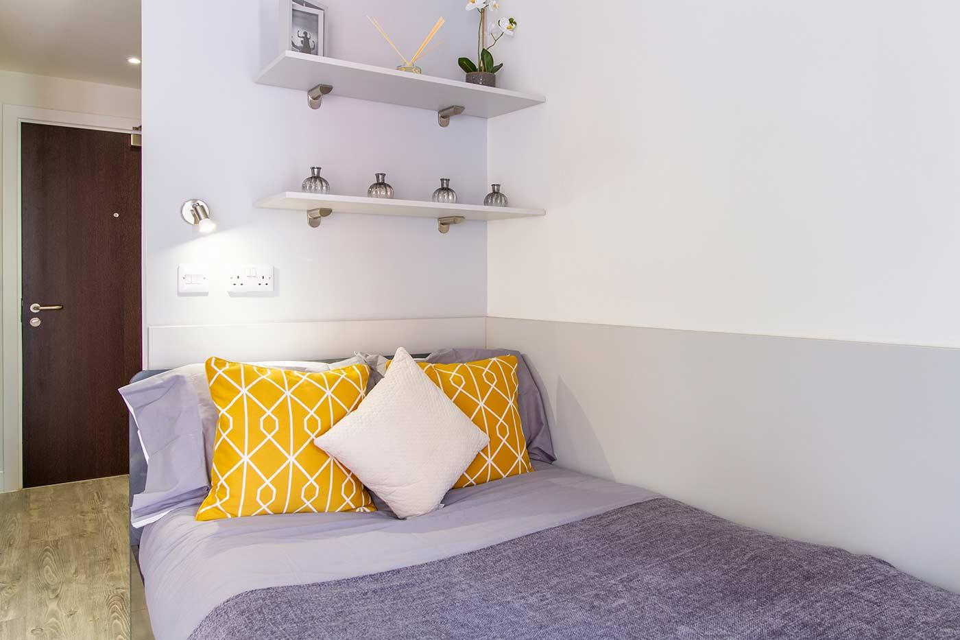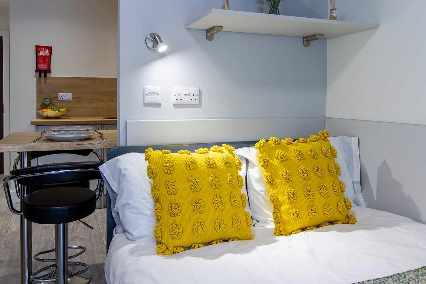 The Premium Studio is our most spacious, high-quality option, designed for students seeking a luxurious, modern space with complete independence. Enjoy your own fully equipped kitchenette, private en-suite bathroom, and a comfy ¾ sized bed perfect for relaxing after a busy day. A dedicated study area with a desk and chair ensures you can stay focused on your work, while high-speed Wi-Fi and your own TV let you unwind on your own terms. Stylish, contemporary furnishings make this premium studio the ultimate choice for discerning students.