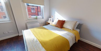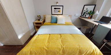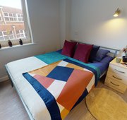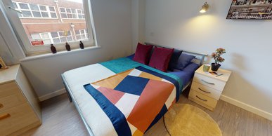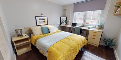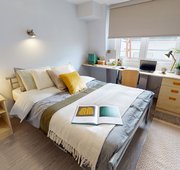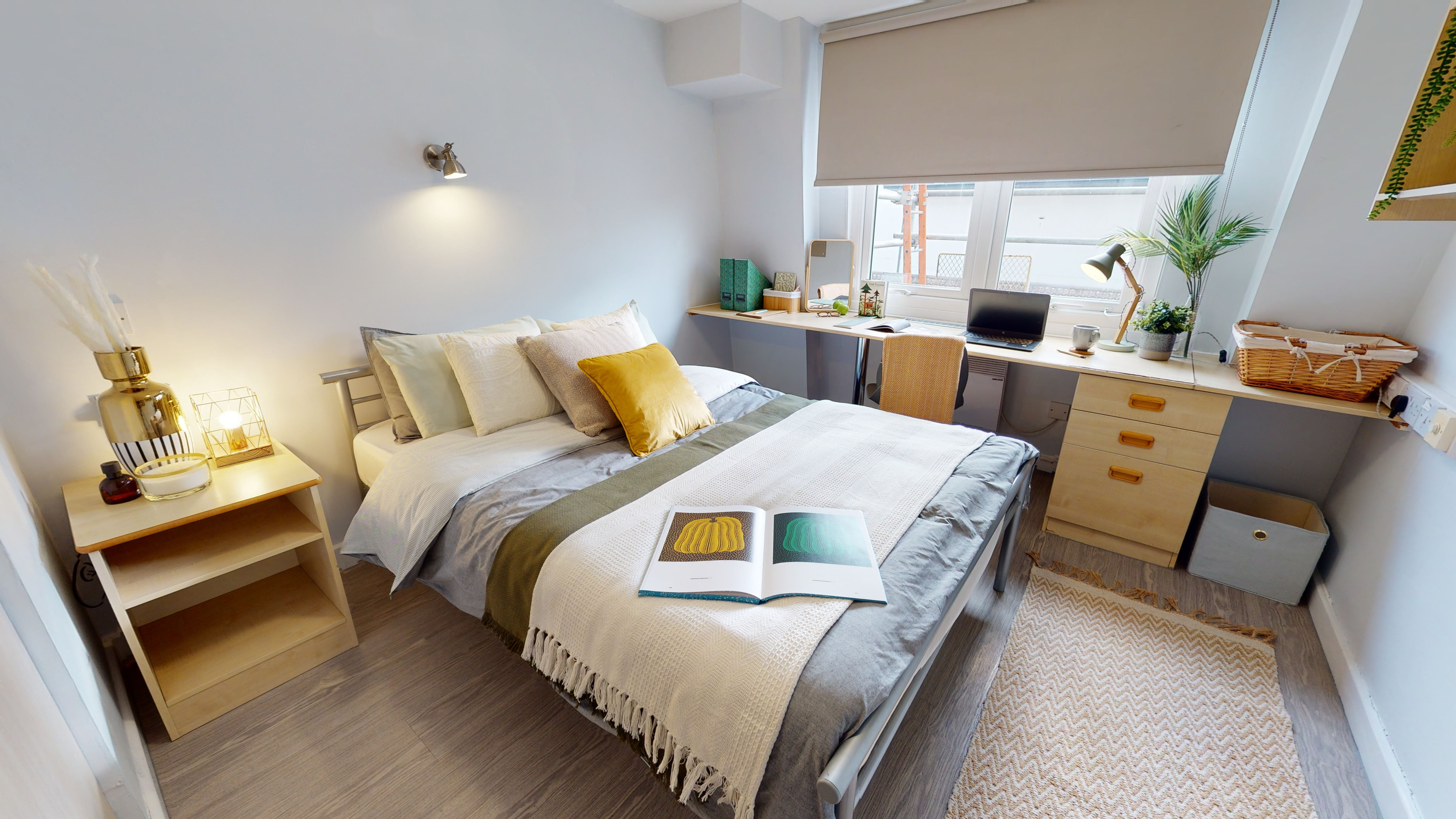 GROS200-031125Great value for money, our Silver En Suite rooms offer all the necessary features for a great student lifestyle Fresh, bright and modern taste the Silver en-suites comes with a small double bed, private bathroom, study desk and chair and storage in shelves, drawers and a wardrobe, these rooms are perfectly formed. You’ll be sharing a spacious kitchen and living area with up to five others, and the building provides great additional facilities with a pool table, onsite laundry and courtyard completing your student living experience.