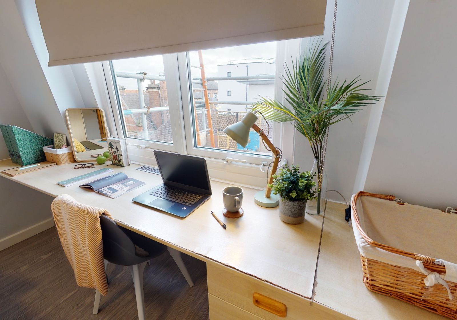 Choose from a view boasting penthouse top floor studio or roomy spacious first floor studio. Either way, you get amples of space and privacy. Enjoy your own private bathroom, fully fitted seperate kitchen with hob and combi oven, double bed, large study desk and chair, TV and armchairs. With all the privacy and storage you could want, you’ll also enjoy building features like a games room, outdoor courtyard with decking and seating plus onsite laundry facilities.