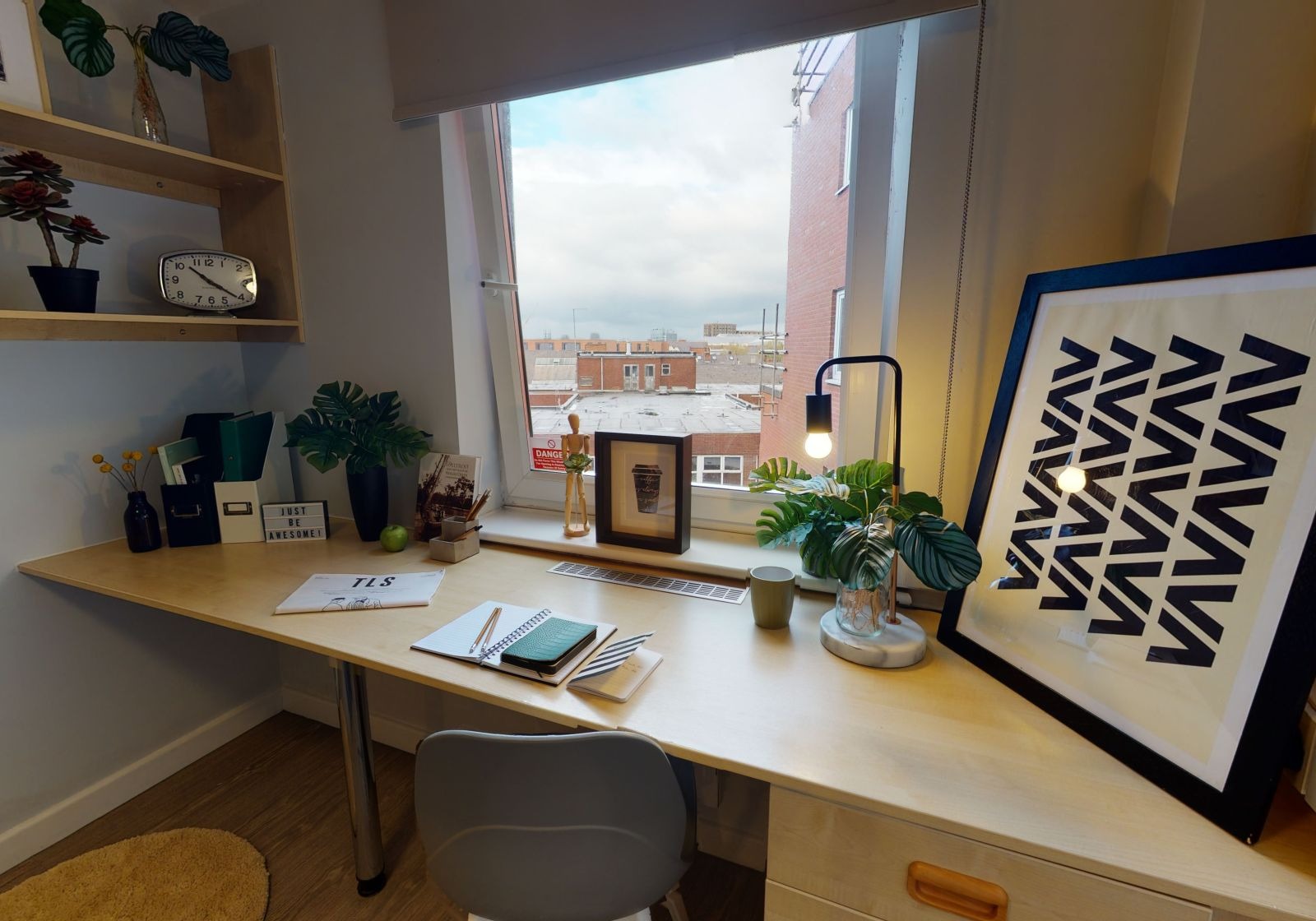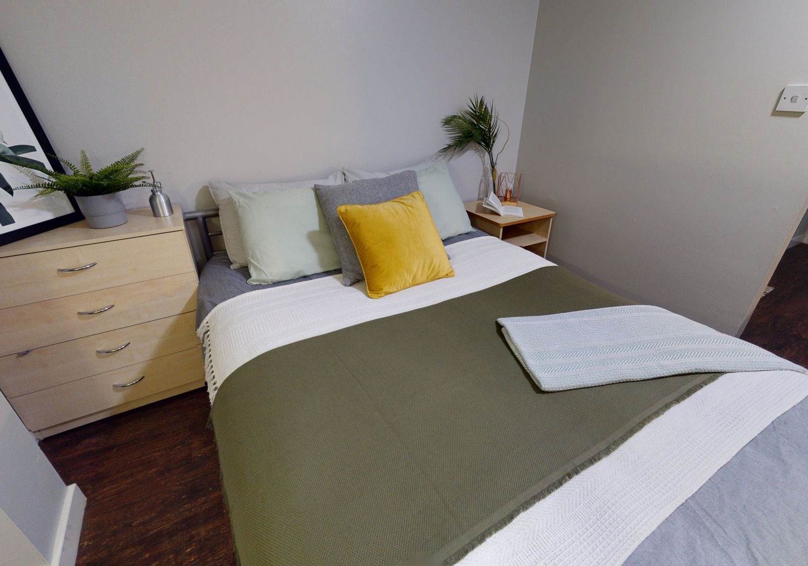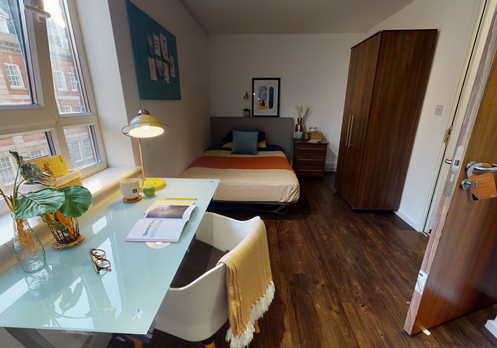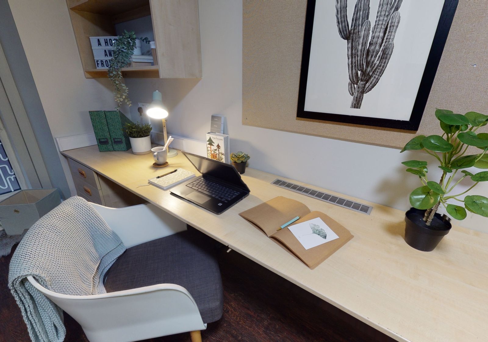 Our entry-level rooms offer all the necessary features for a great student lifestyle Our excellent value for money Bronze en suite rooms come equipped with a small double bed, private bathroom, study desk and chair and storage in shelves, drawers and a wardrobe, classic and modern to suit any style. Sharing a spacious kitchen and living area with up to five others, the building also provides you with a pool table, onsite laundry and courtyard in the building.