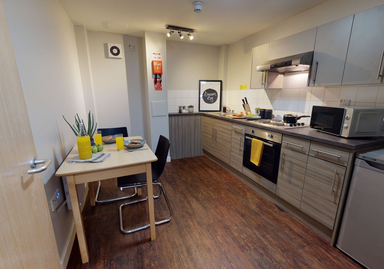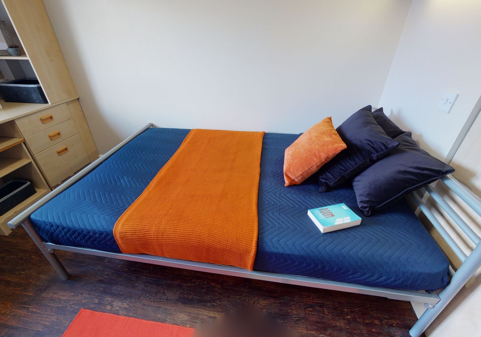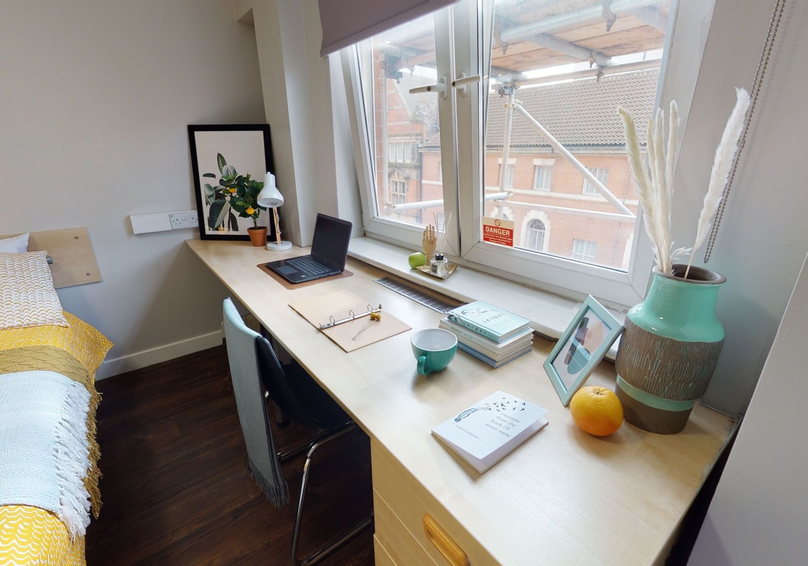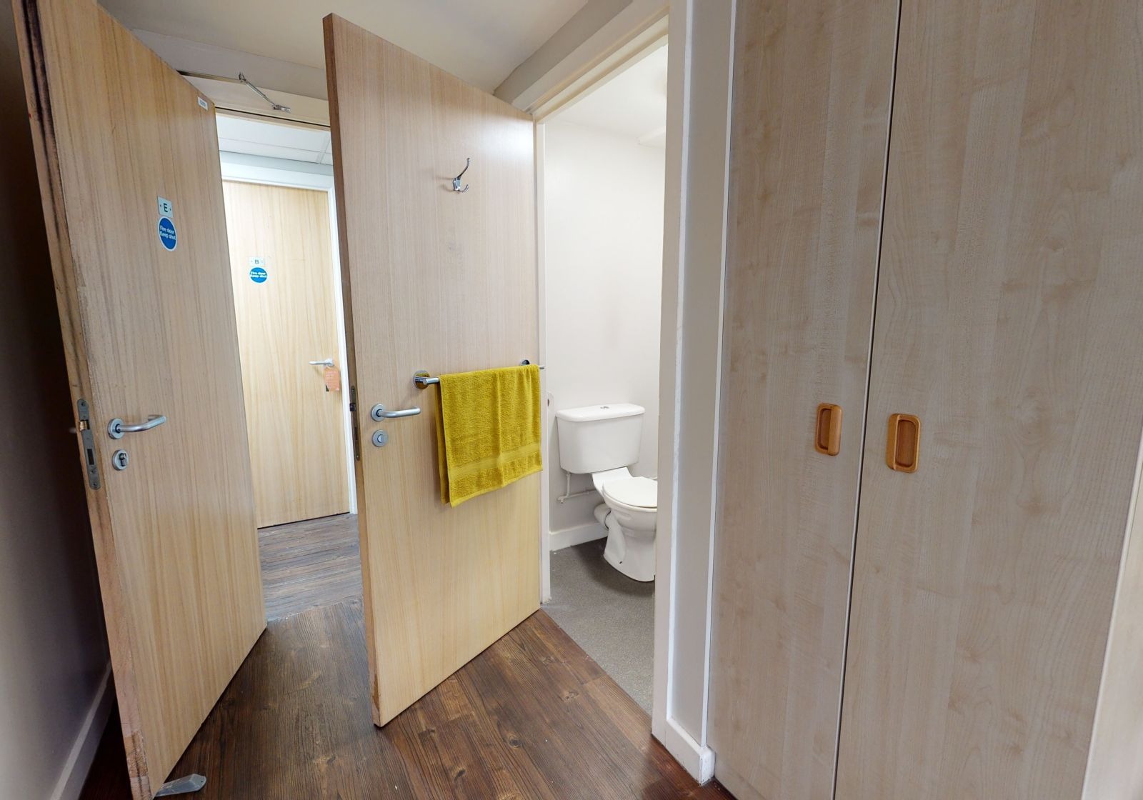 Our entry-level rooms offer all the necessary features for a great student lifestyle Our excellent value for money Bronze en suite rooms come equipped with a small double bed, private bathroom, study desk and chair and storage in shelves, drawers and a wardrobe, classic and modern to suit any style. Sharing a spacious kitchen and living area with up to five others, the building also provides you with a pool table, onsite laundry and courtyard in the building.