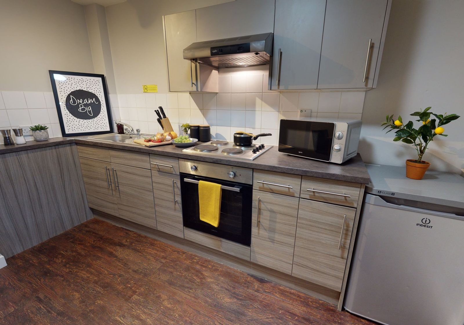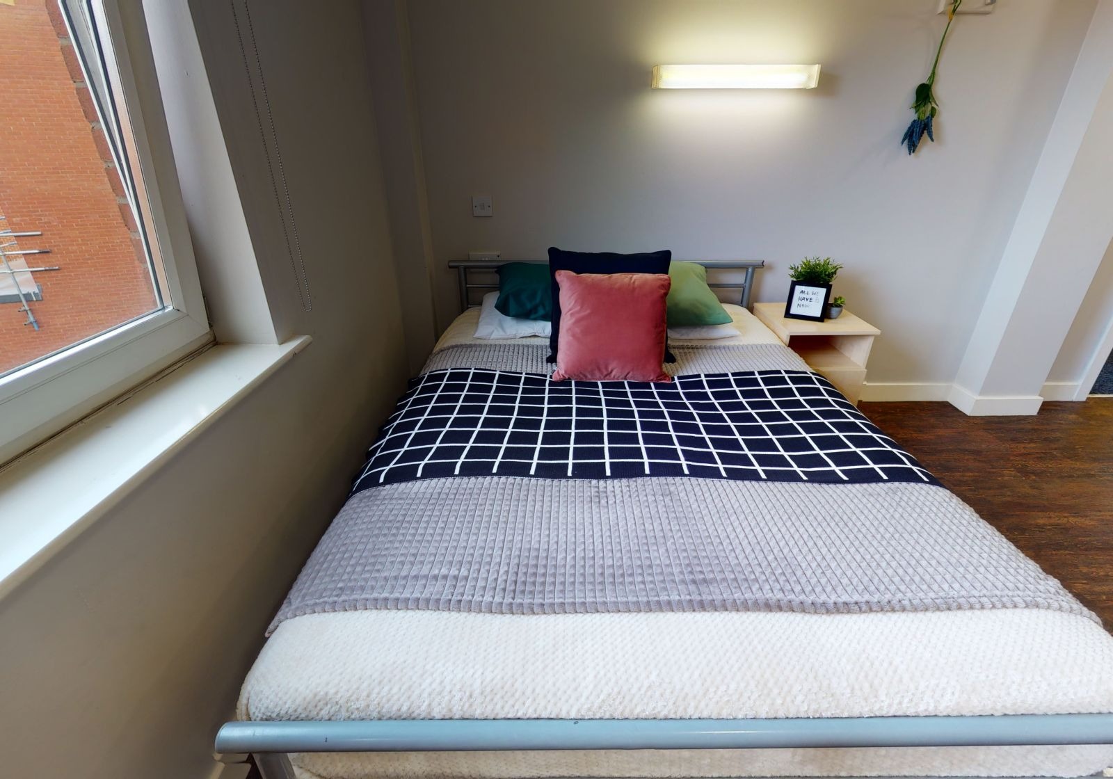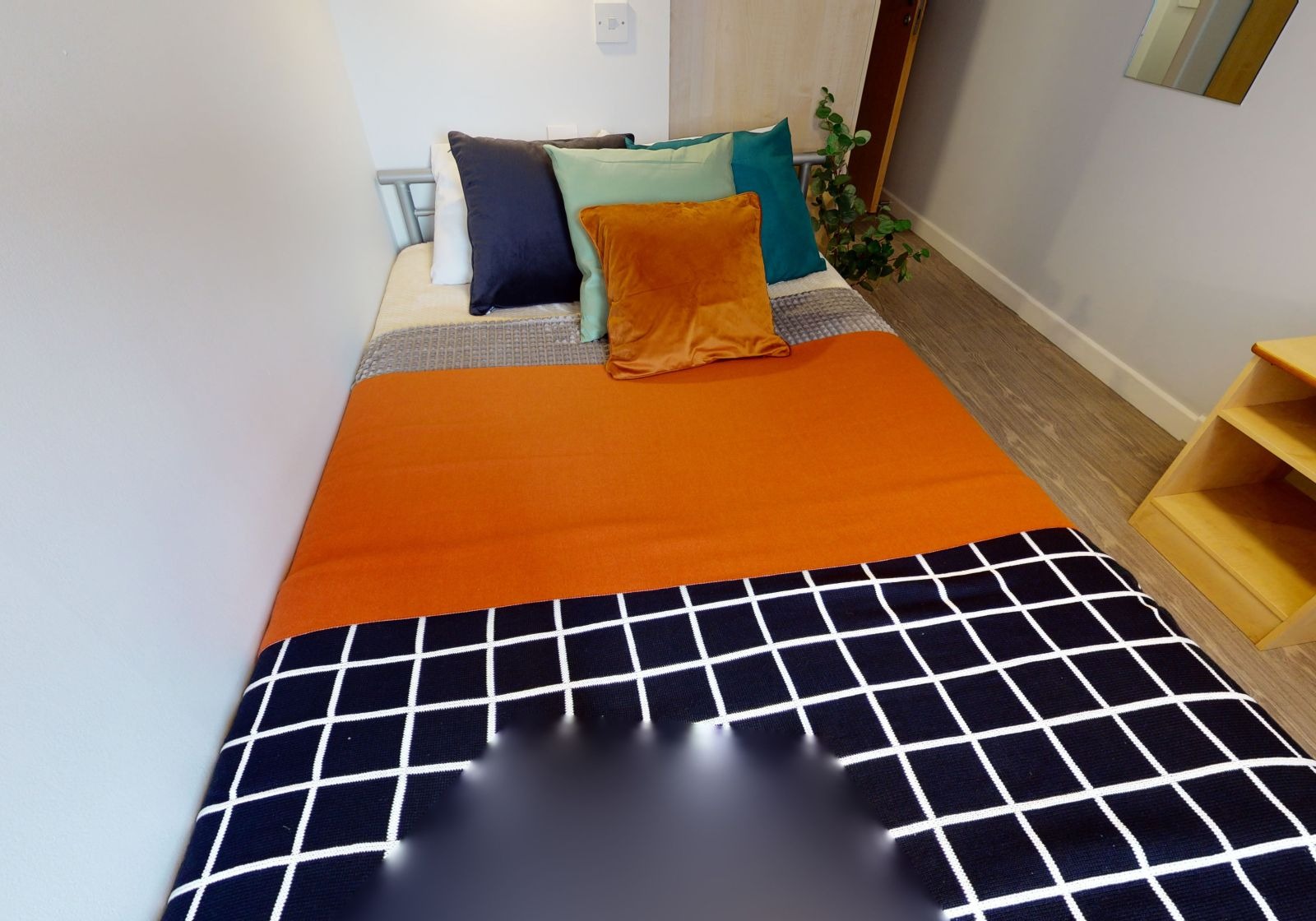 Great value for money, our Silver En Suite rooms offer all the necessary features for a great student lifestyle Fresh, bright and modern taste the Silver en-suites comes with a small double bed, private bathroom, study desk and chair and storage in shelves, drawers and a wardrobe, these rooms are perfectly formed. You’ll be sharing a spacious kitchen and living area with up to five others, and the building provides great additional facilities with a pool table, onsite laundry and courtyard completing your student living experience.