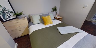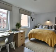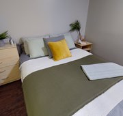 GROS200-031125Ideal for those that want the maximum amount of room, our refurbished Platinum en-suite gives you all that little extra in modern, slick style. Newly refurbished including a double bed, private bathroom, larger study desk space with chair and storage in shelves, drawers and a wardrobe, these rooms are a delight. You’ll share a spacious kitchen and living area with up to five others, and in the building you will also find a pool table, onsite laundry and a courtyard with seating and decking, providing everything you need.