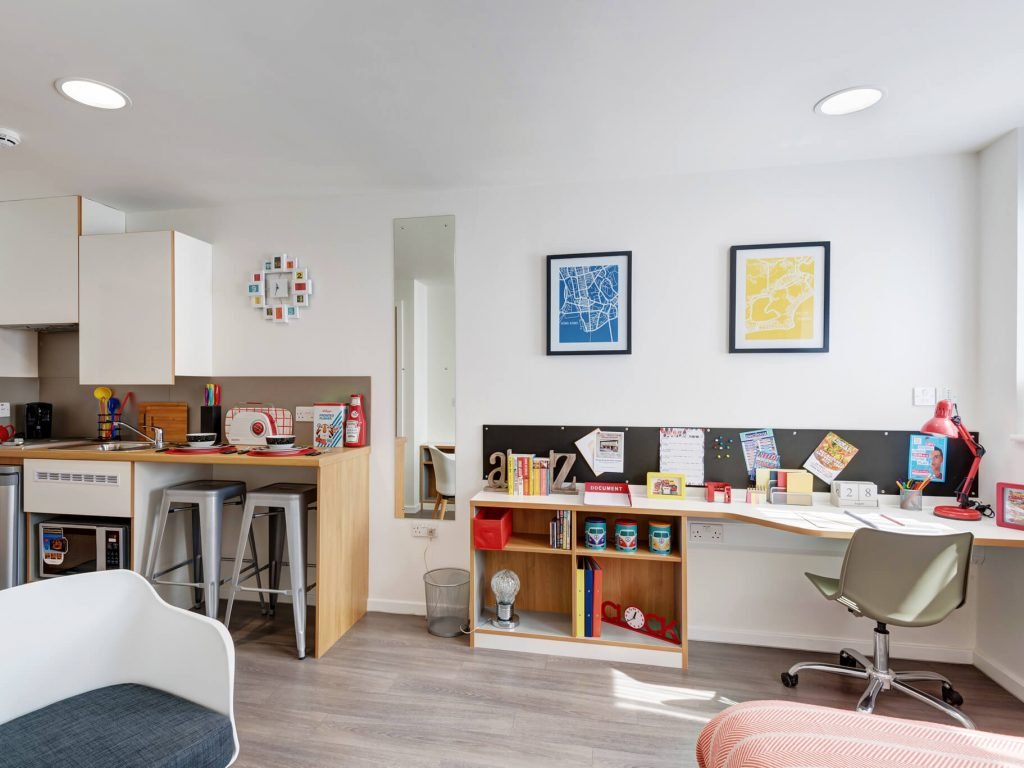 Self-contained studio apartment (18-19.6m2) - open-plan living space with fitted kitchen and en-suite shower room What's included Fitted kitchen (under counter fridge with small freezer compartment, two ring hob and combination microwave) Small double bed Wardrobe with three draws Study desk with chair Notice board above the desk Full-length mirror Three coat hooks Free-standing shelving unit Electric heater Roller blind 32 inch TV Fire blanket Ensuite shower room