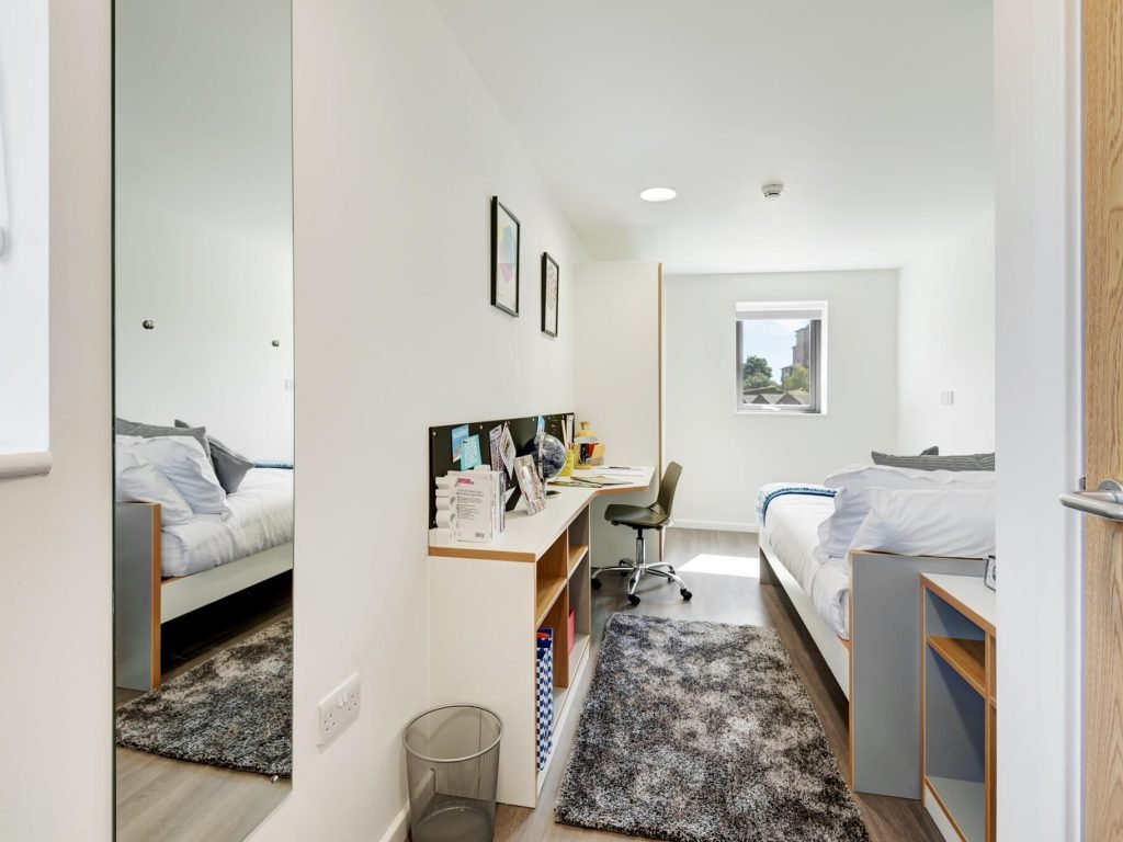 En-suite bedroom (16.6-23.6m2) in shared apartment What's included Ensuite shower room Small double bed Wardrobe with three draws Study desk with chair Notice board above the desk Full-length mirror Three coat hooks Free-standing shelving unit Electric heater Roller blind 32 inch TV Shared kitchen / living room