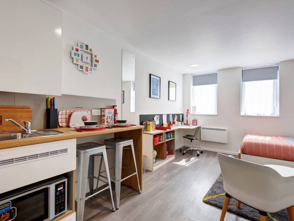Self-contained studio apartment (16.5-17.9m2) - open-plan living space with fitted kitchen and en-suite shower room What's included Fitted kitchen (under counter fridge with small freezer compartment, two ring hob and combination microwave) Small double bed Wardrobe with three draws Study desk with chair Notice board above the desk Full-length mirror Three coat hooks Free-standing shelving unit Electric heater Roller blind 32 inch TV Fire blanket Ensuite shower room