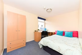 Communal kitchen and living space. Up to 6 rooms per flat Small double bed, wardrobe, desk and chair (Please note that bedding and other soft-furnishings are not included) Communal kitchen with washing machine Shower room with additional WC 8.6m2 approximately